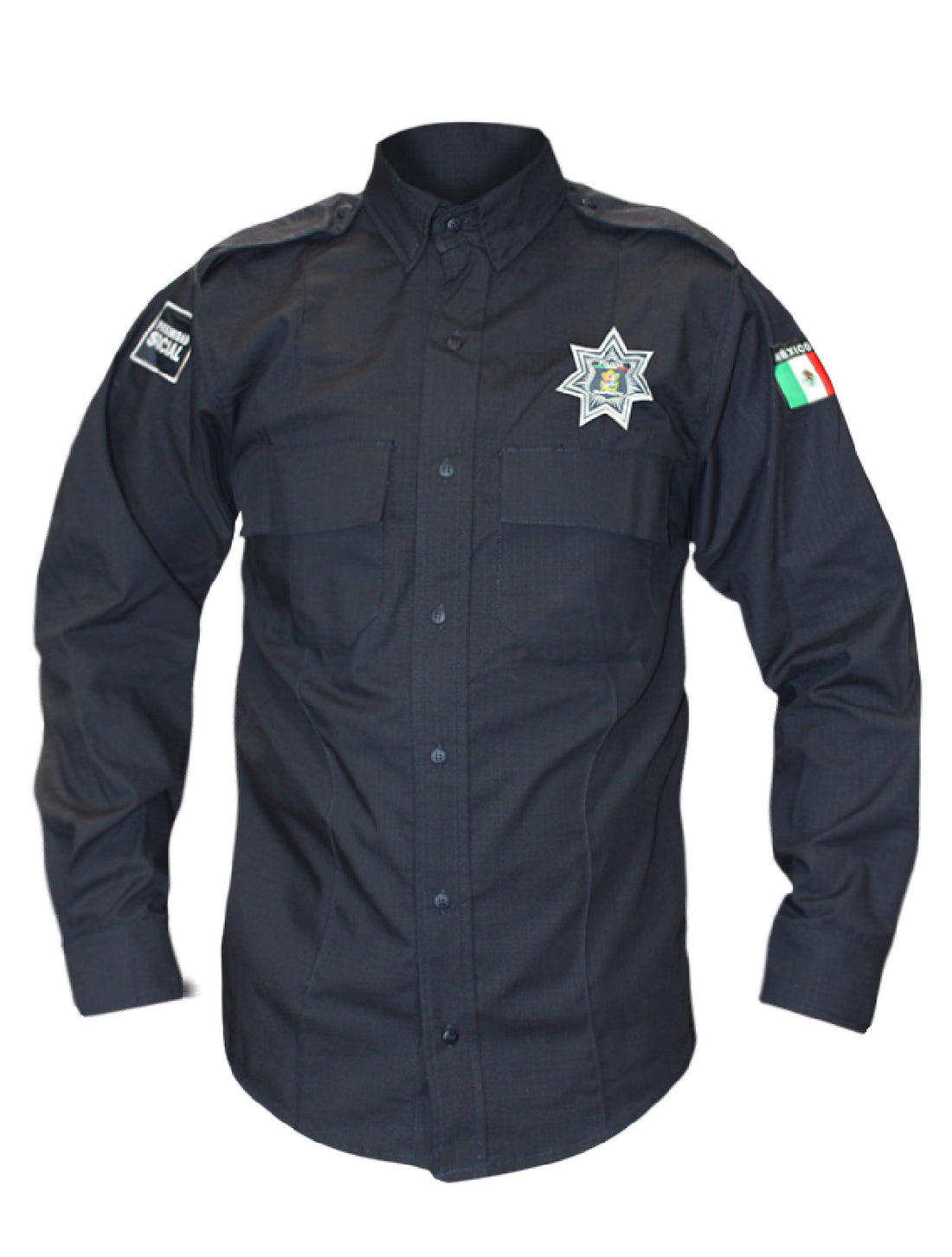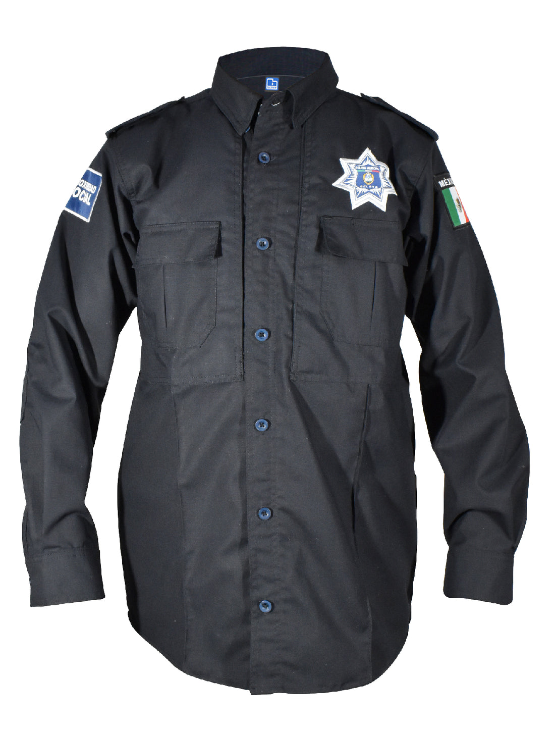 Camisa corte tipo recto, estilo policía en manga larga, con portagrados en hombros.