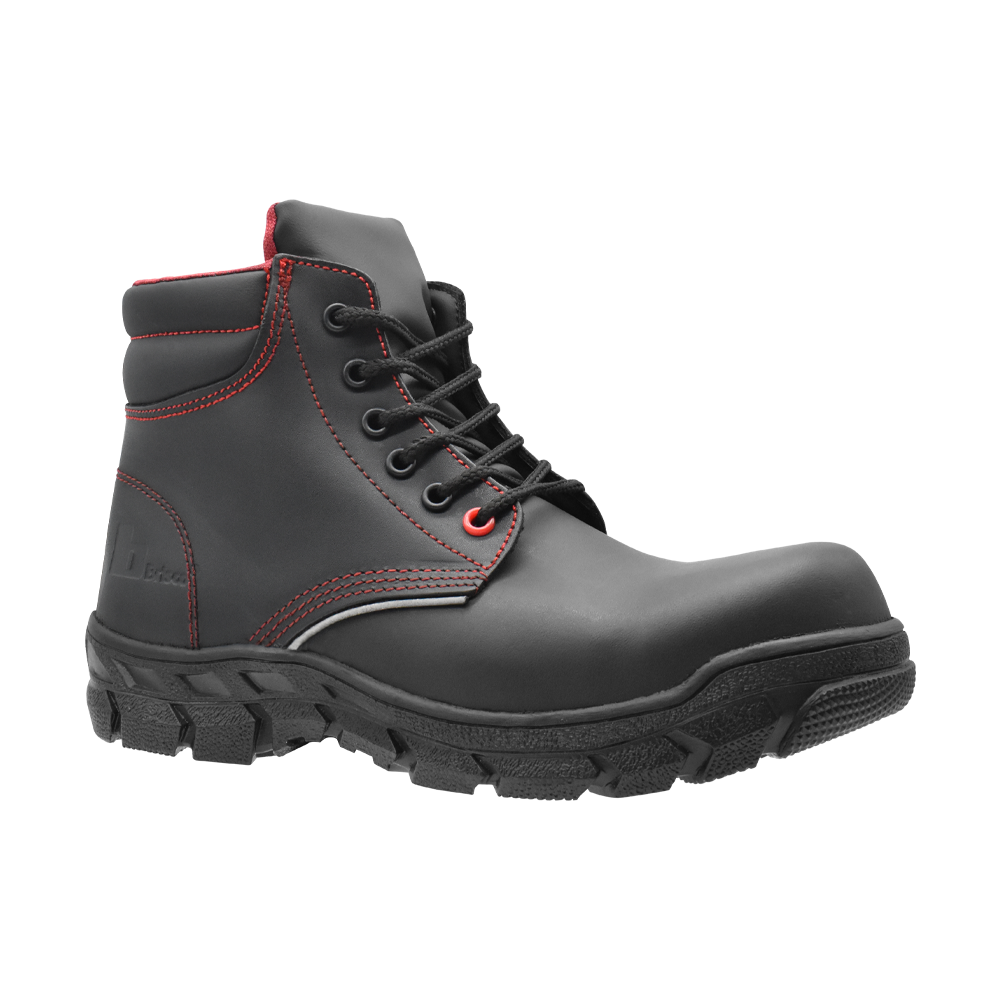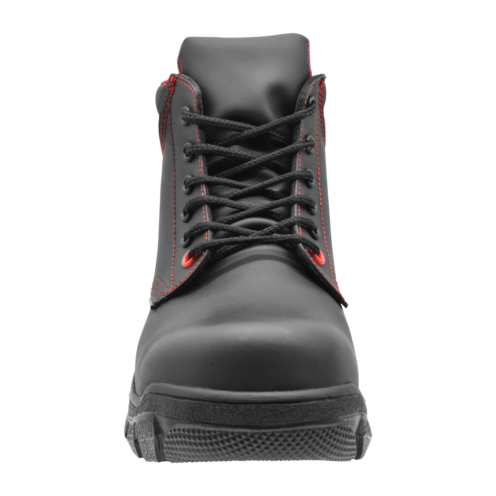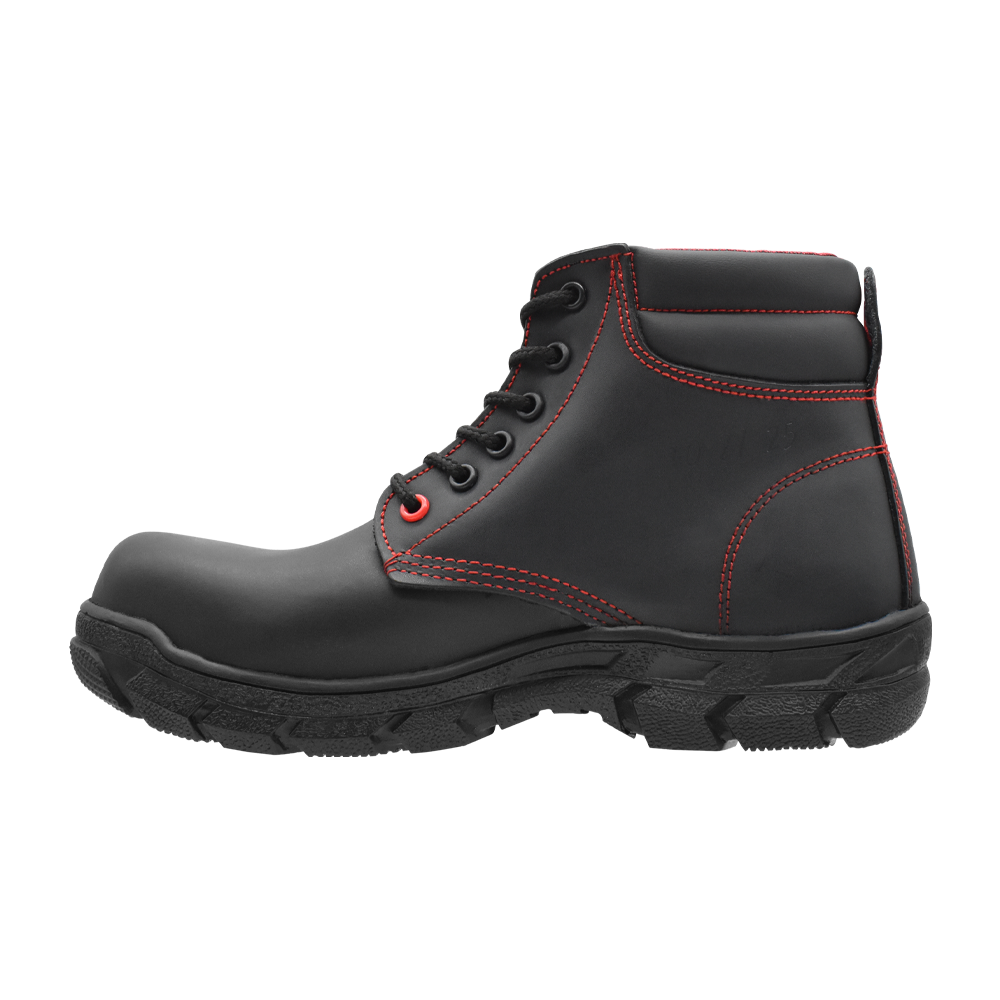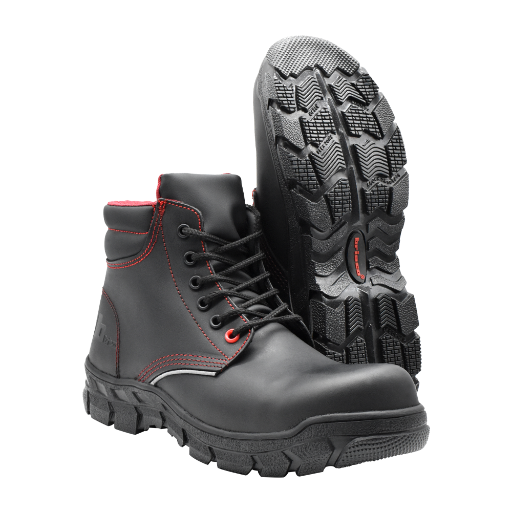 Calzado ergonómico antifatiga, dieléctrico tipo borceguí, color negro con vivos en color rojo, cuenta con protección en la puntera.