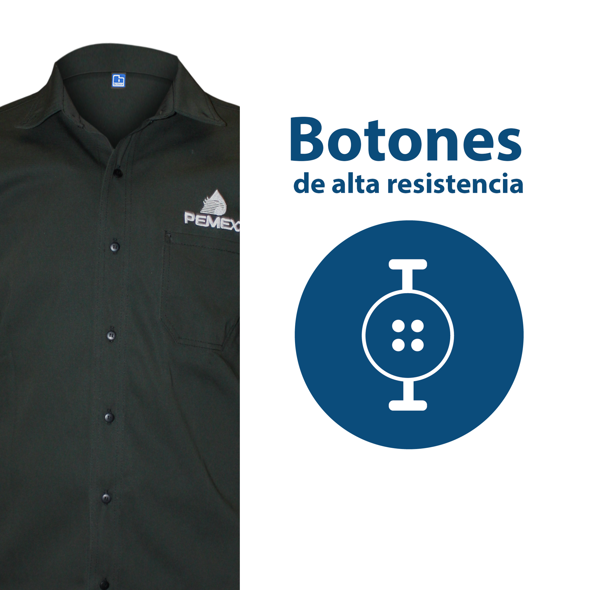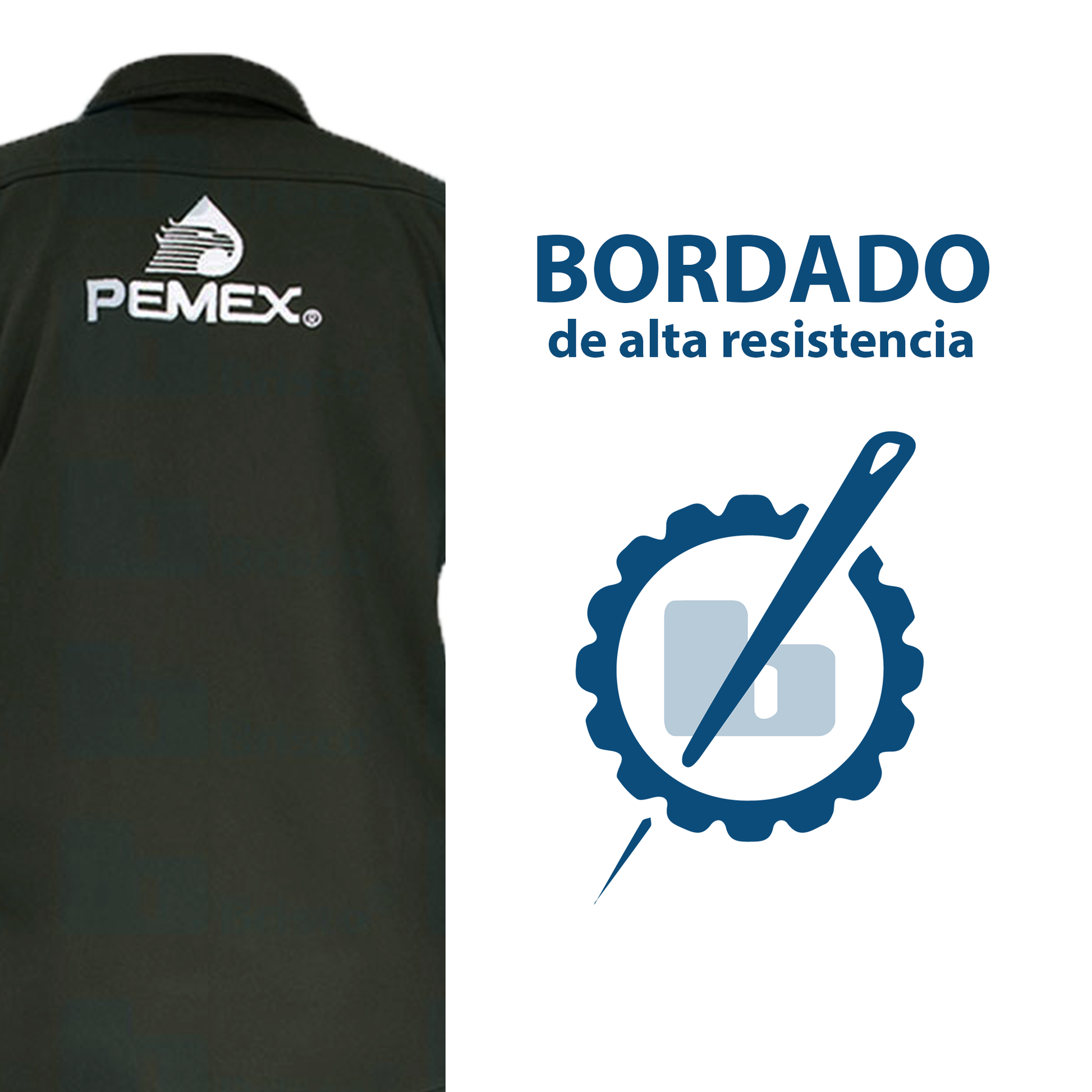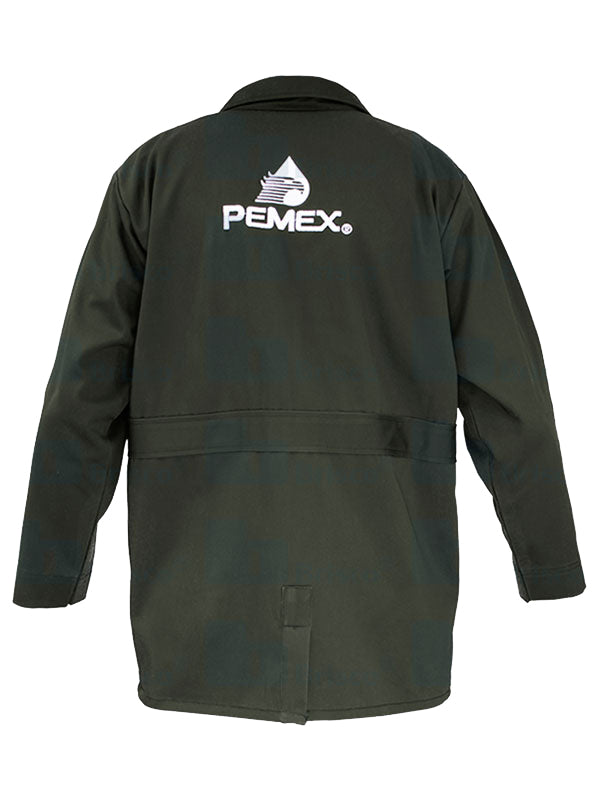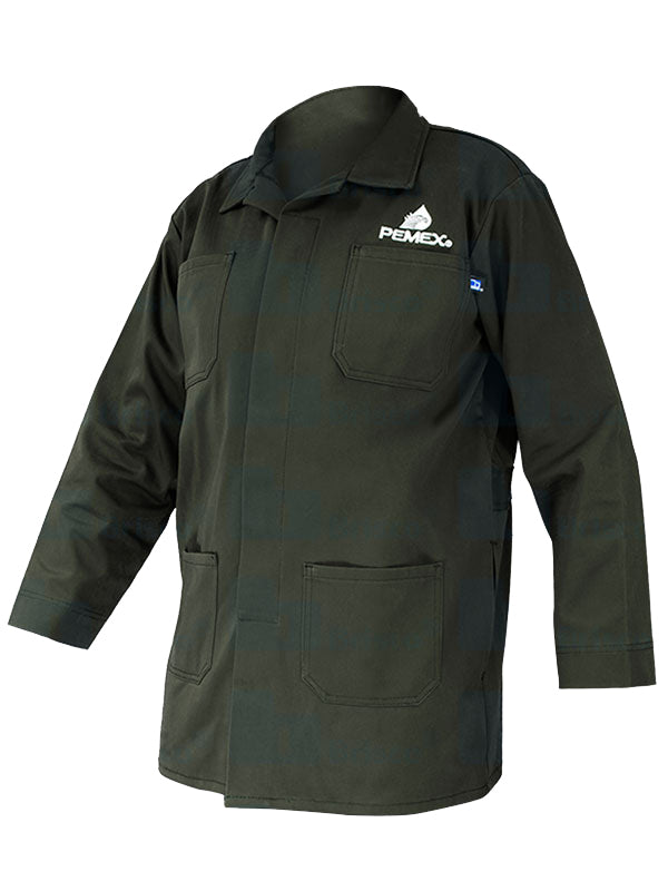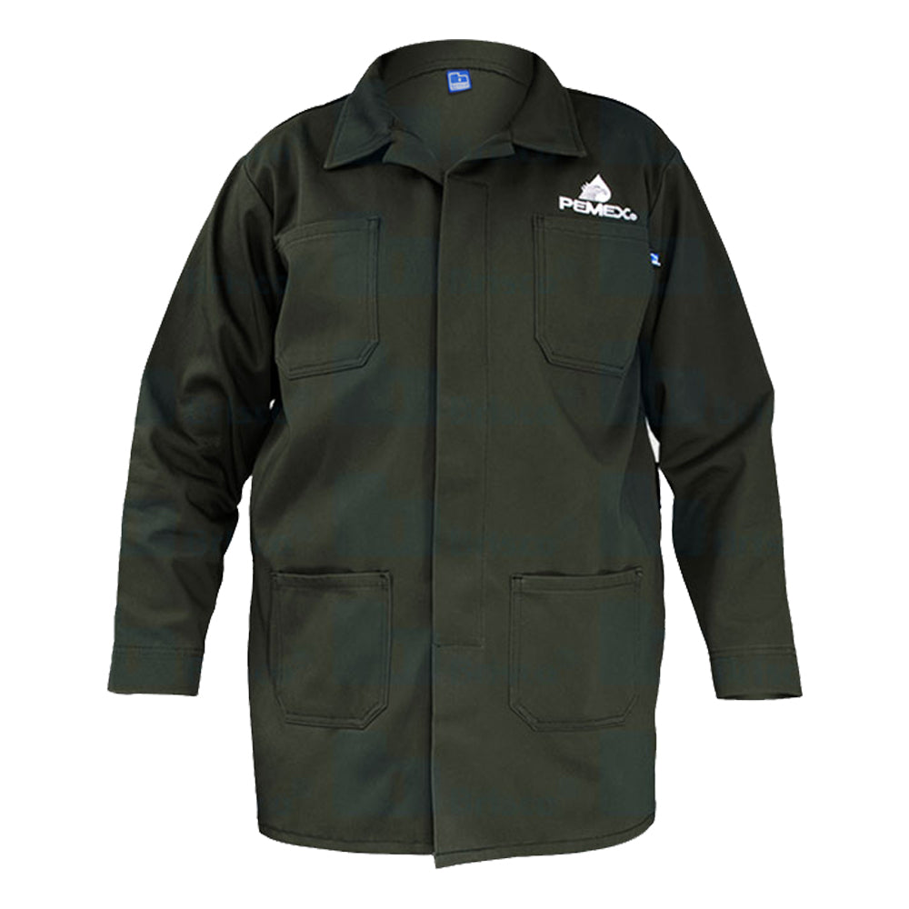 Bata manga larga para despachador de gasolinera Pemex imagen tradicional. Incluye bordados electrónicos PEMEX. Gabardina 100% algodón antiestática en 9.03 oz / yd2 de peso. Color Verde Olivo Obscuro. Corte unisex Confeccionado bajo la manual de uso de marcas PEMEX.