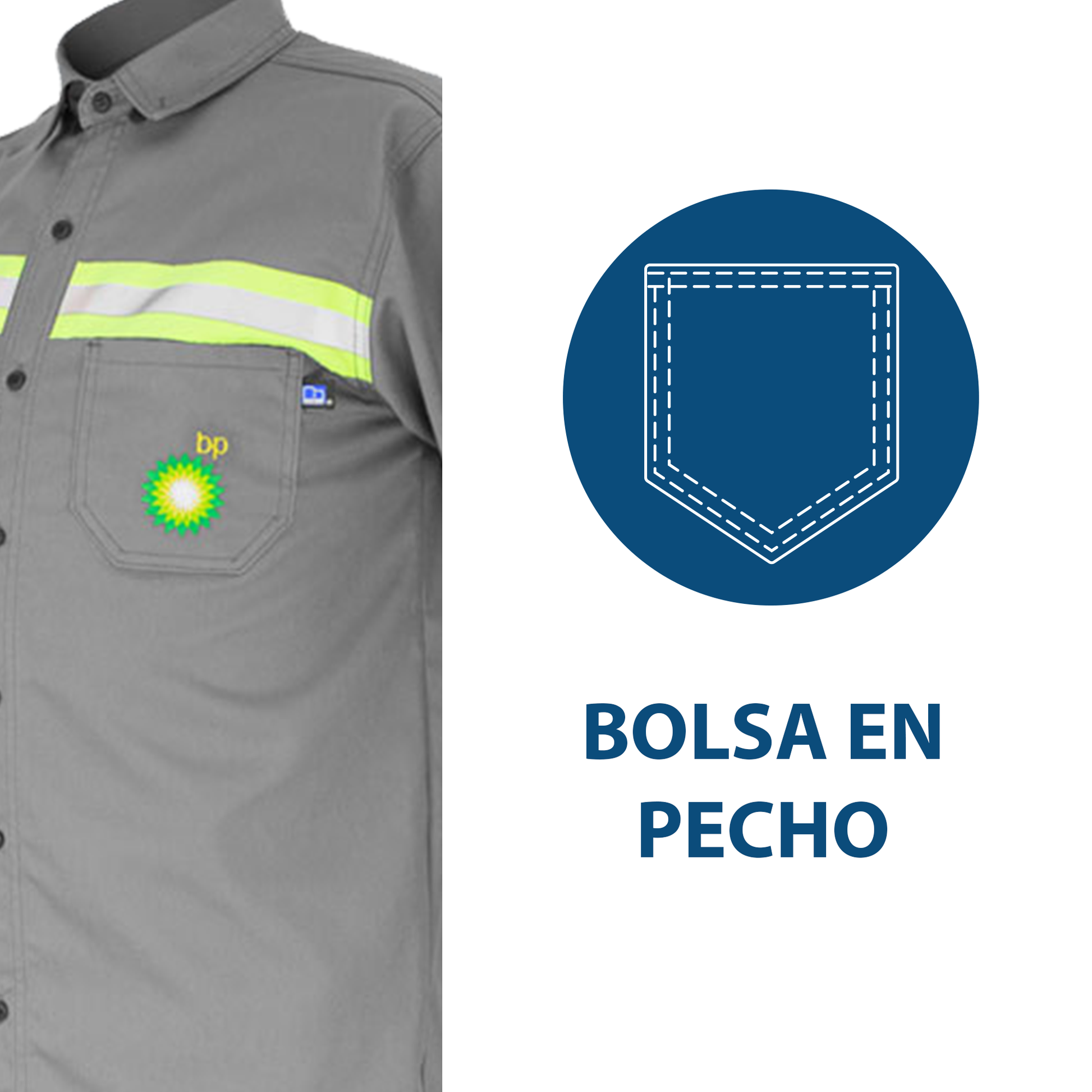 Características: Camisola industrial en manga larga. Una Bolsa de parche con presillas de refuerzo, al frente superior. Bolsa de fácil acceso. Confeccionadas con 7 botones al frente, cuello y en puños para ajuste de alta resistencia antiestáticos. Costuras Reforzadas en mangas y costados. Remalles interiores en prenda con costuras reforzadas 5 hilos. Cinta reflejante de dos pulgada de ancho color amarillo / plata colocada en brazos, frente y espalda. Bordados electrónicos BP en pecho y espalda, de acuerdo a manual institucional.