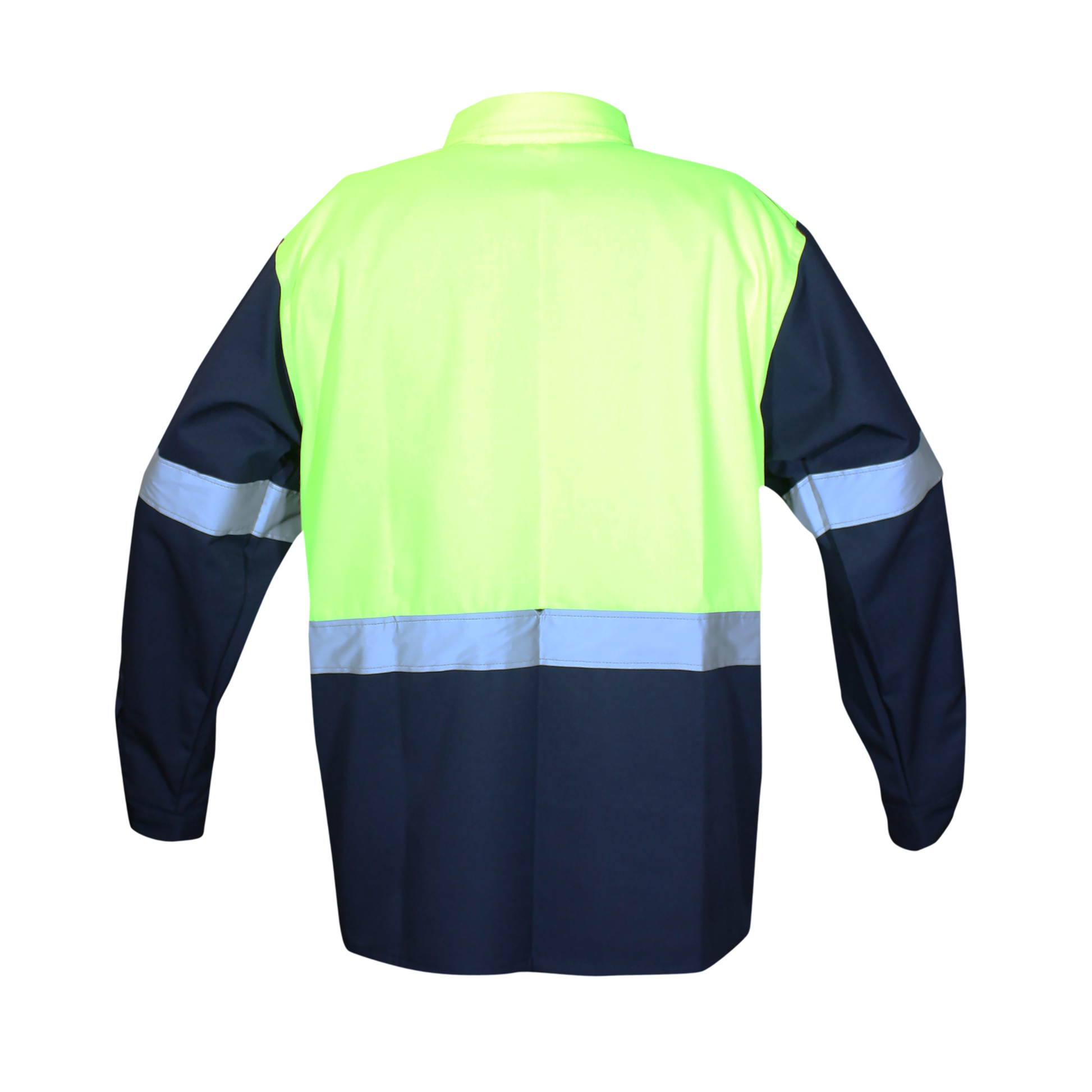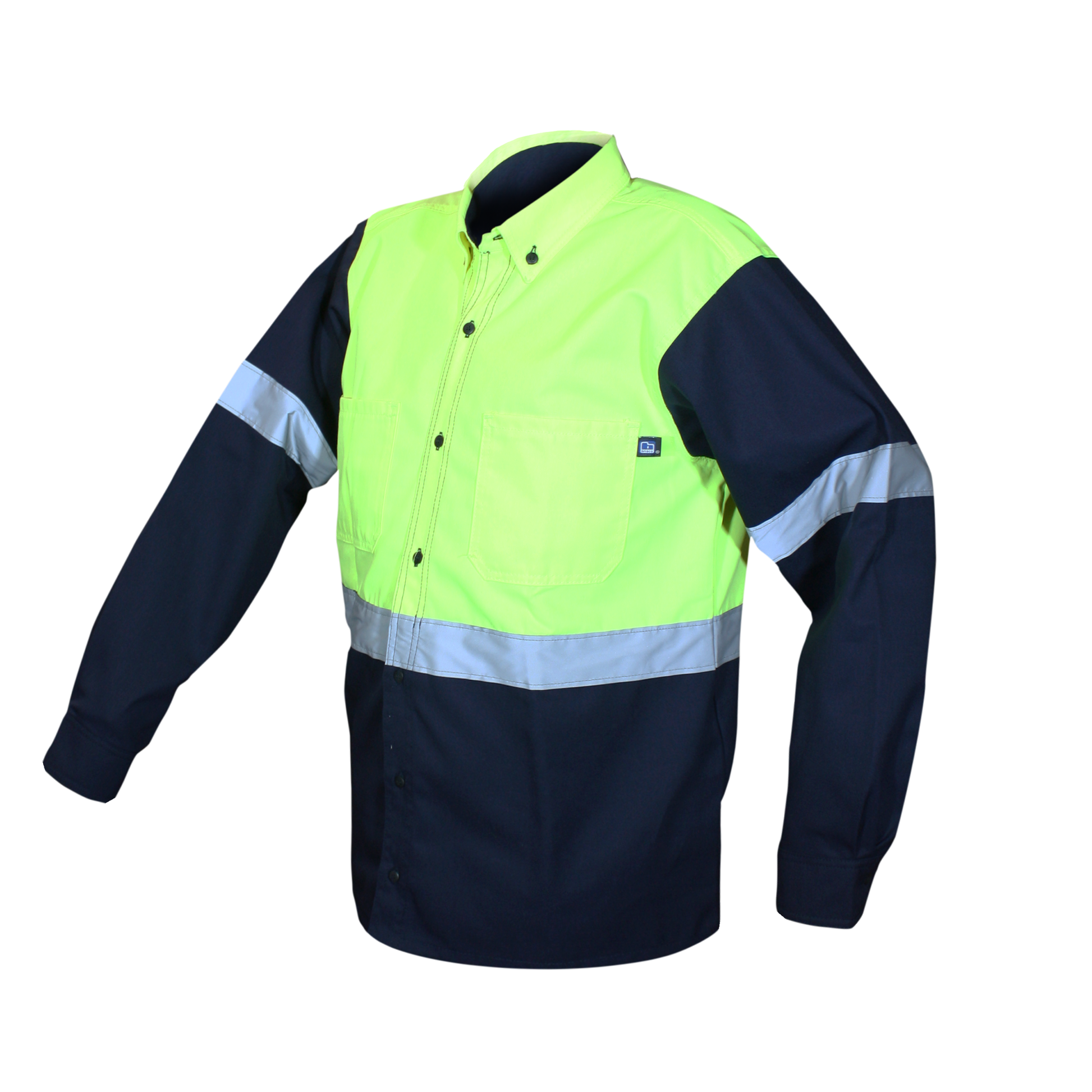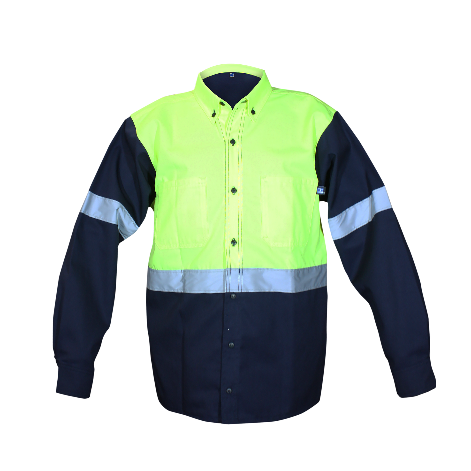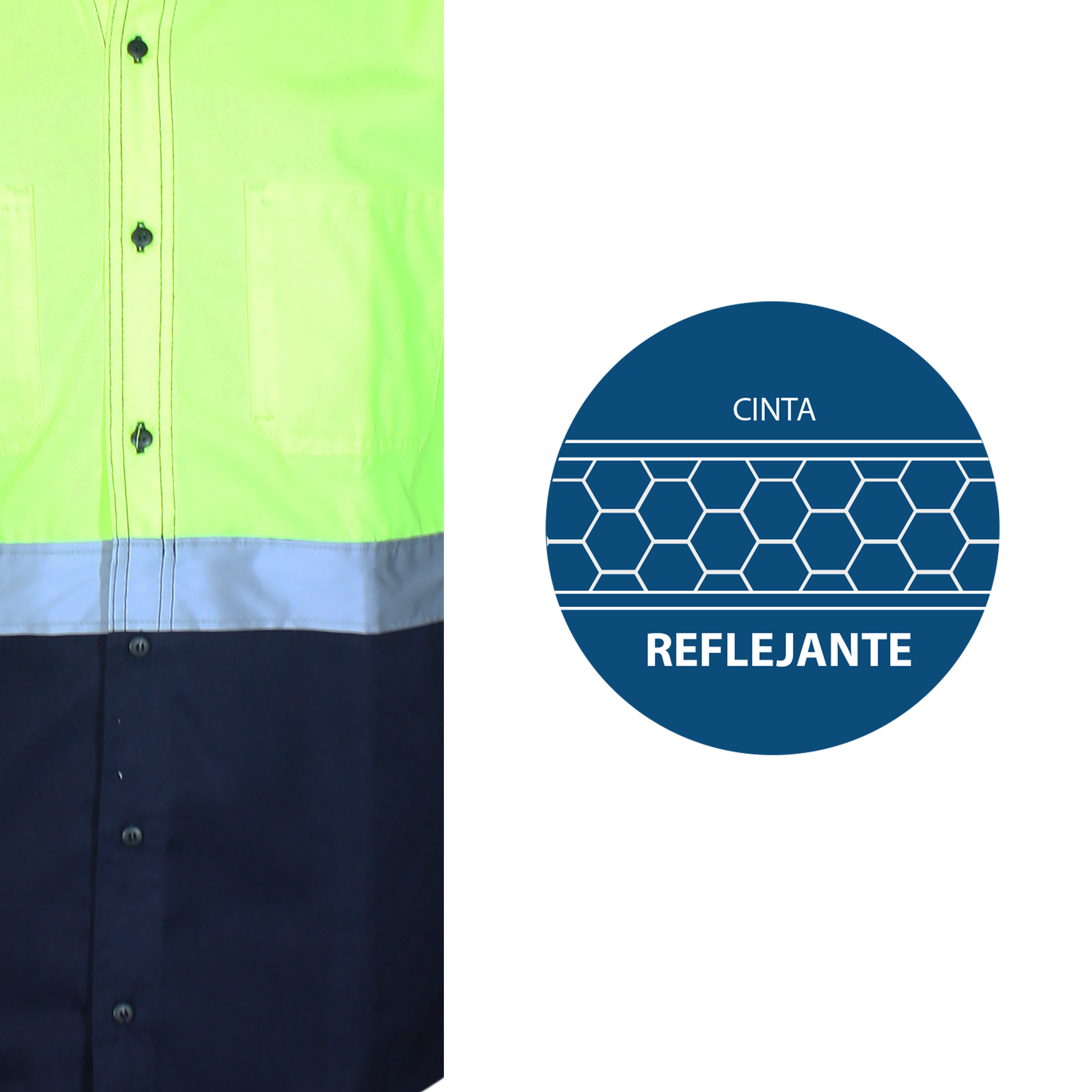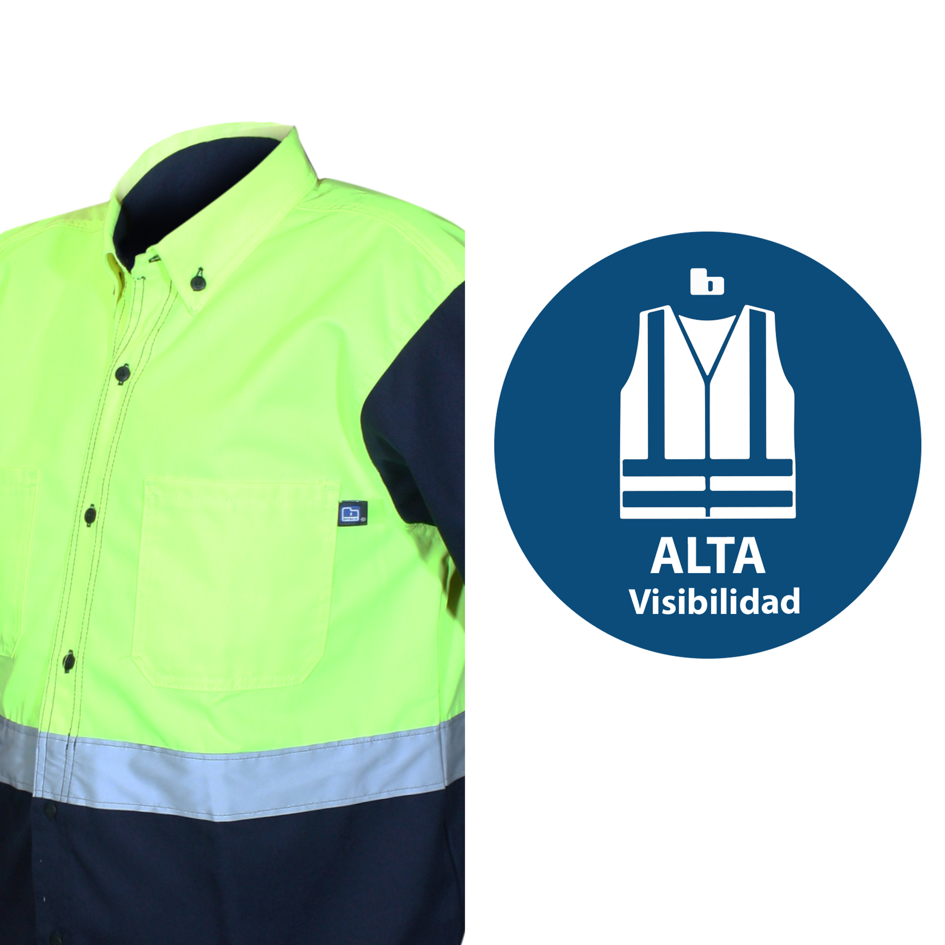 Diseñada para ofrecer seguridad y alta visibilidad. Cuenta con doble bolsa frontal de fácil acceso, siete botones expuestos de pasta al frente, pie de cuello y botones en cuello.