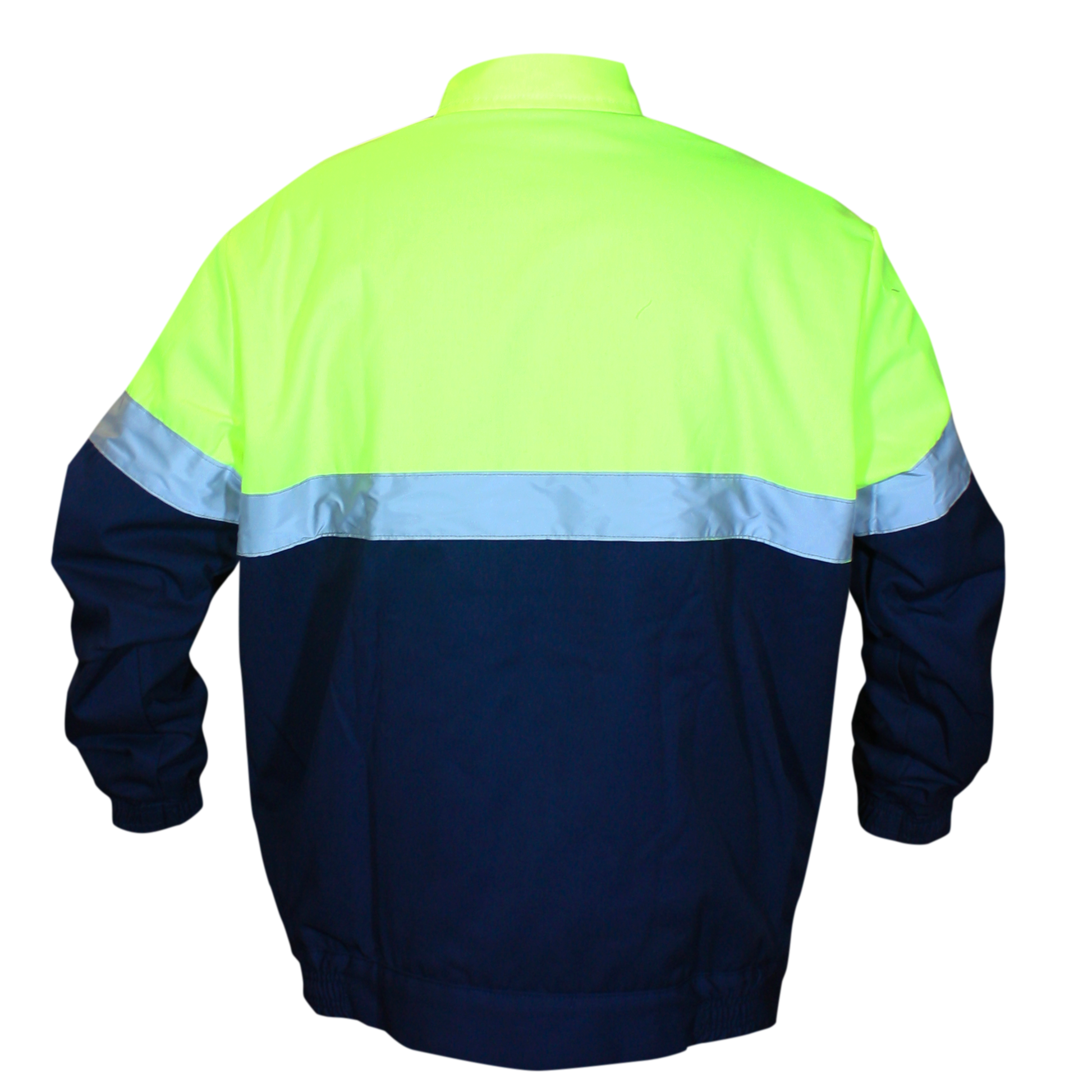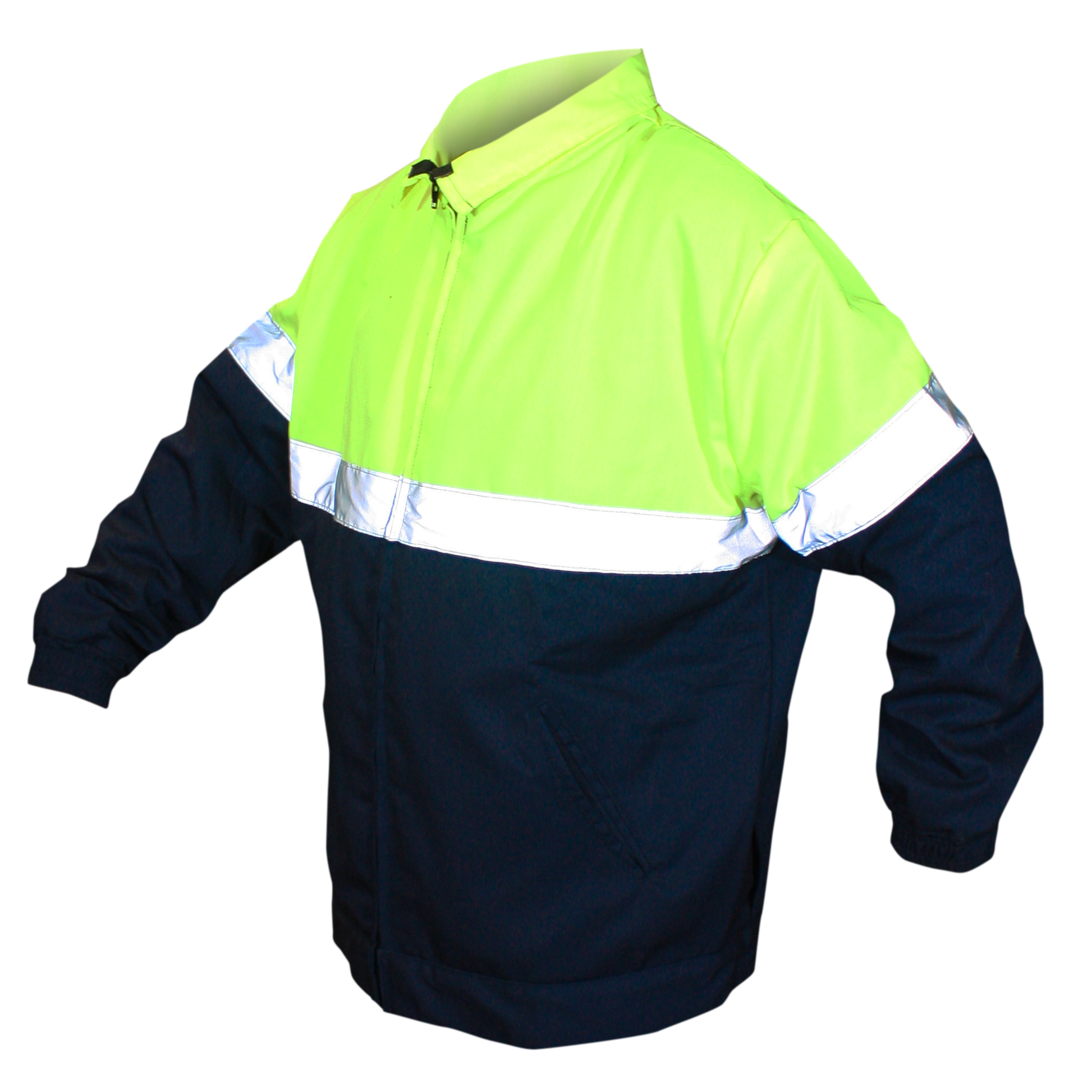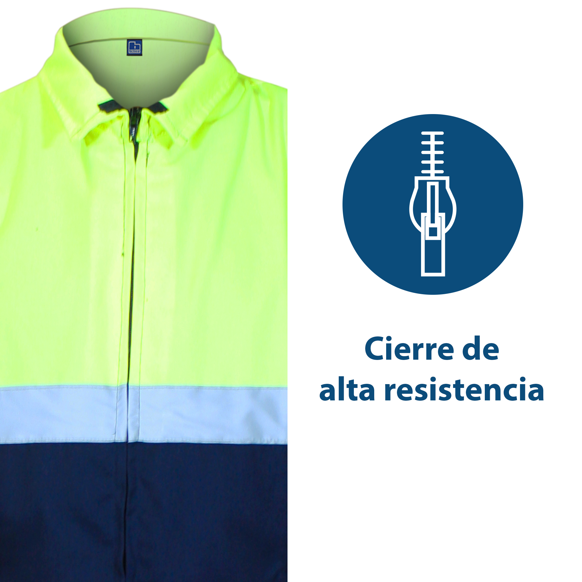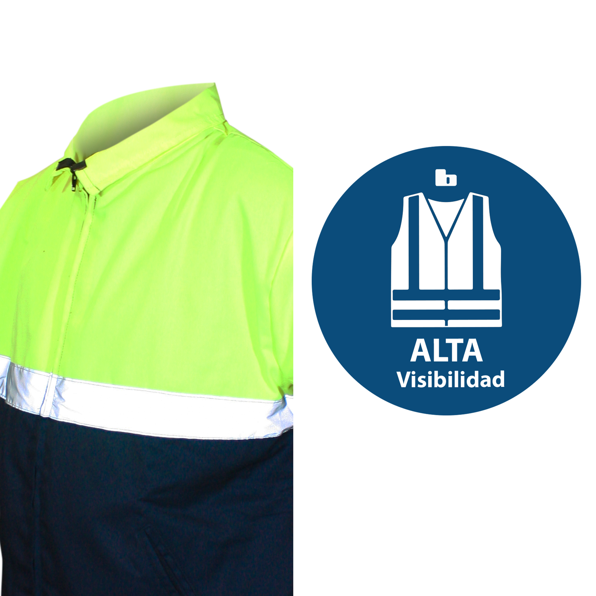 Diseñada para ofrecer protección y máxima visibilidad. Cuenta con cierre frontal de plástico antiestático, vivos en gabardina NEÓN de alta visibilidad (A.V.) y cinta reflejante 3M de 2” color gris plata en cintura y brazos.
