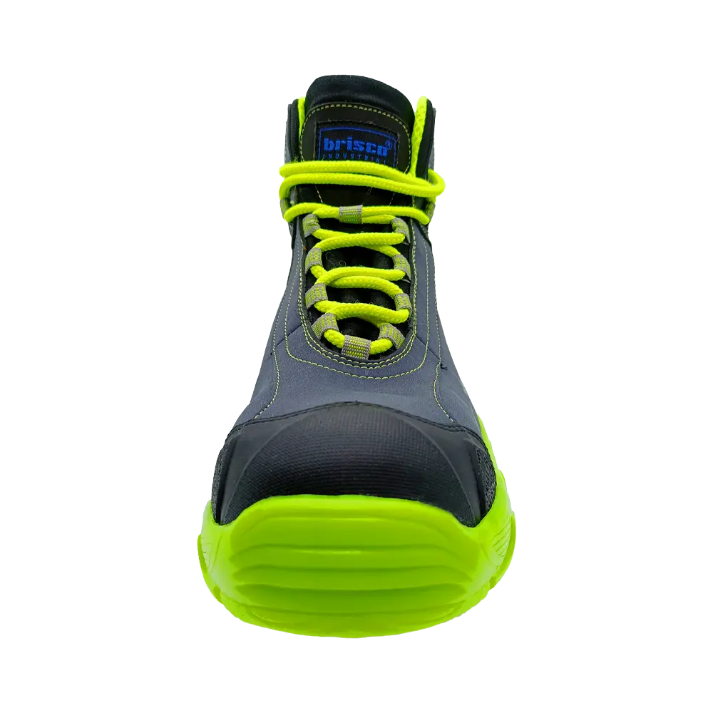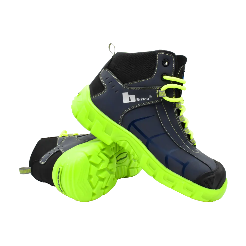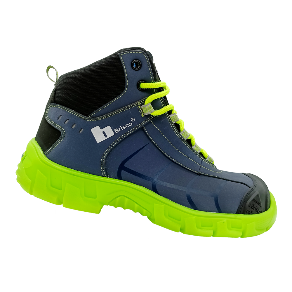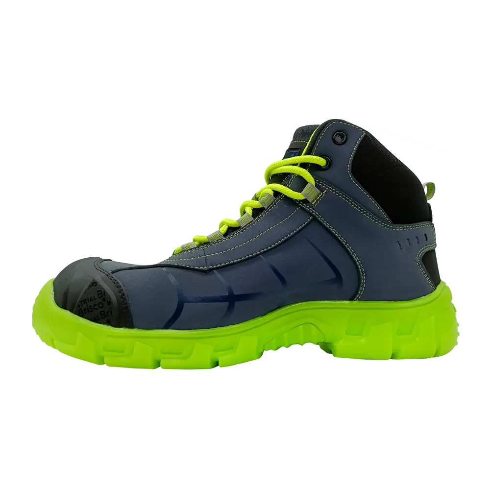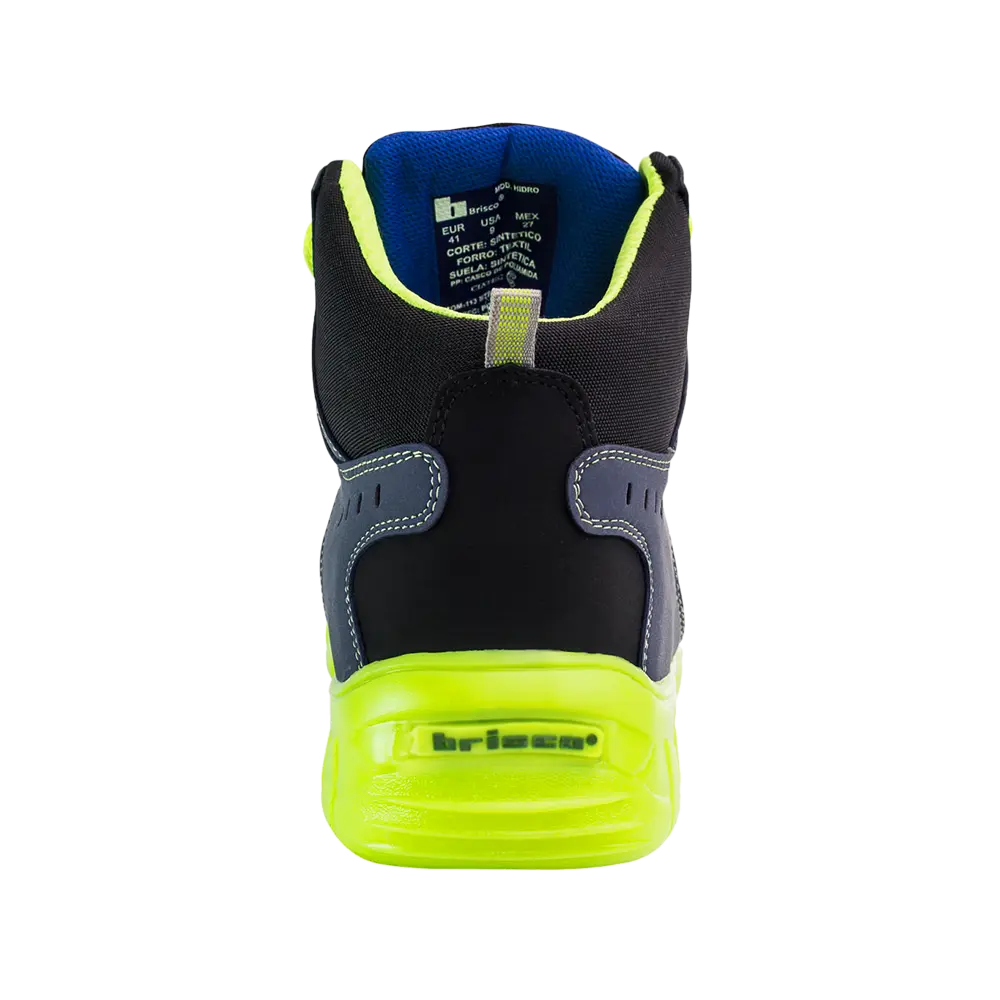 Calzado ergonómico, dieléctrico tipo borceguí, color azul con vivos en verde neón, cuenta con doble protección en la puntera (resistente a abrasión).
