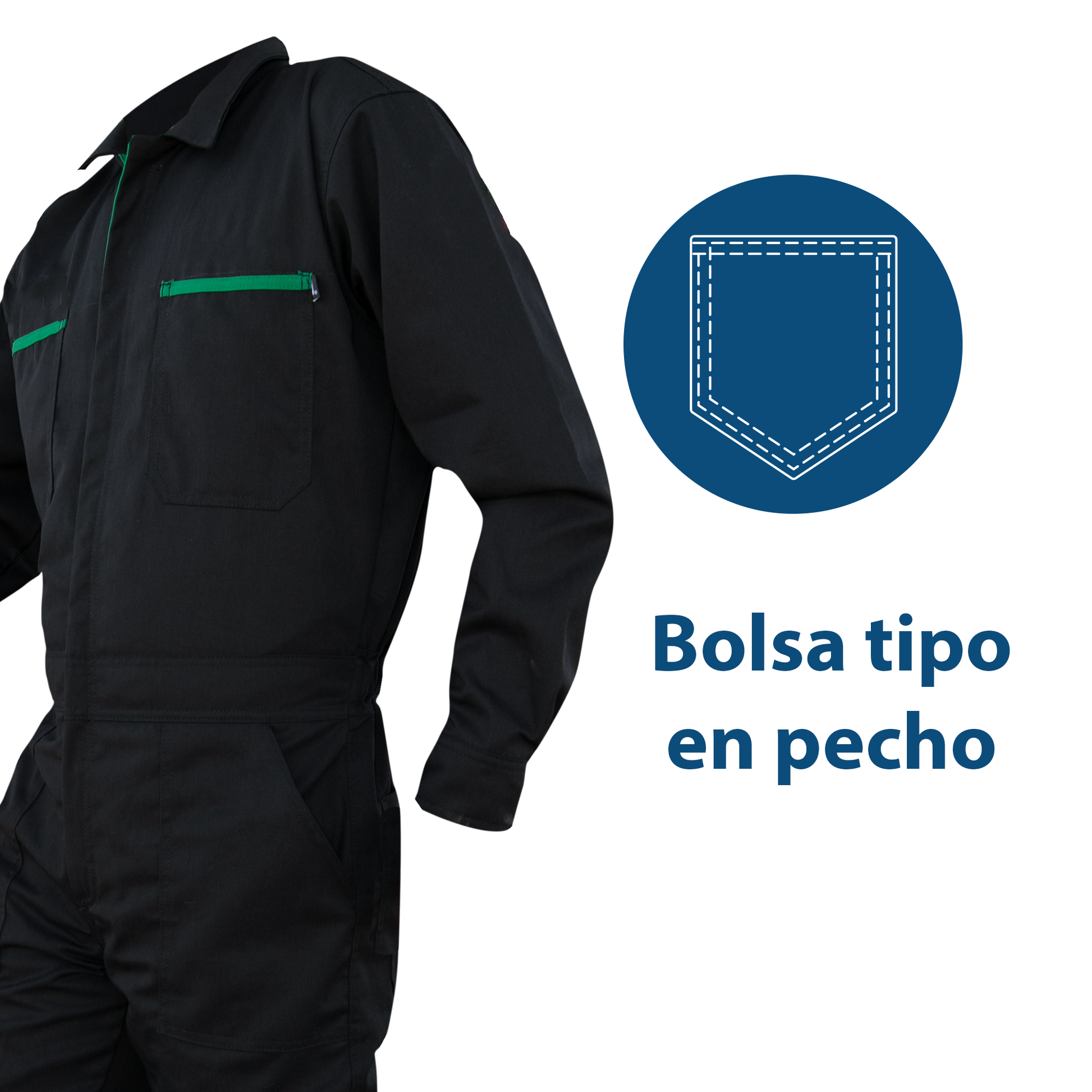 Manga larga con cierre plástico oculto al frente de alta resistencia antiestático. Diseñado con 6 Bolsas, localizadas 4 en pantalón, 2 delanteras en diagonal y 2 traseras tipo parche para contenidos de fácil acceso.