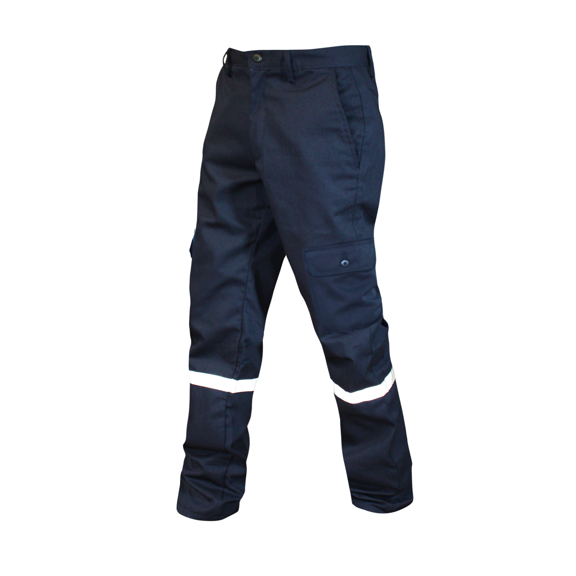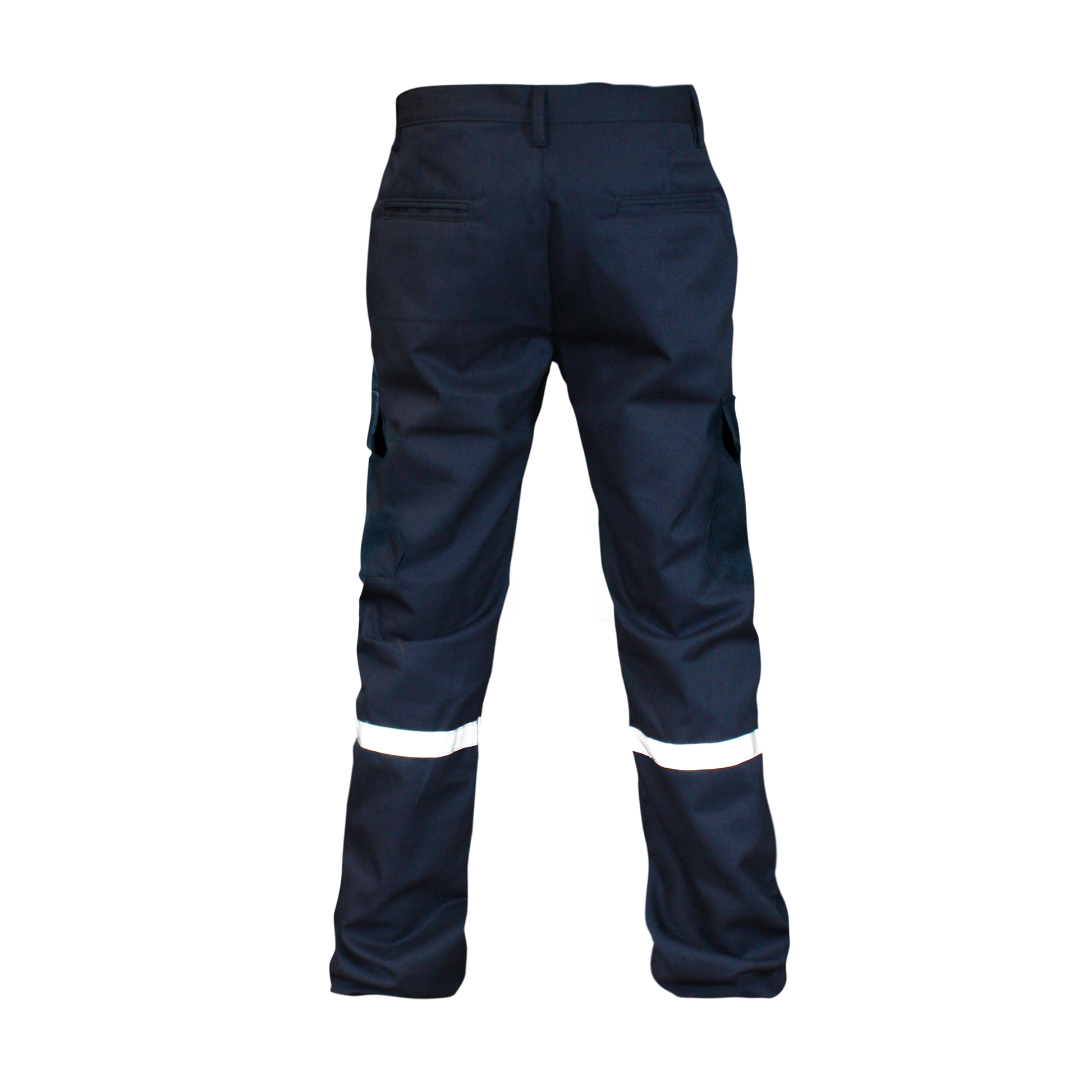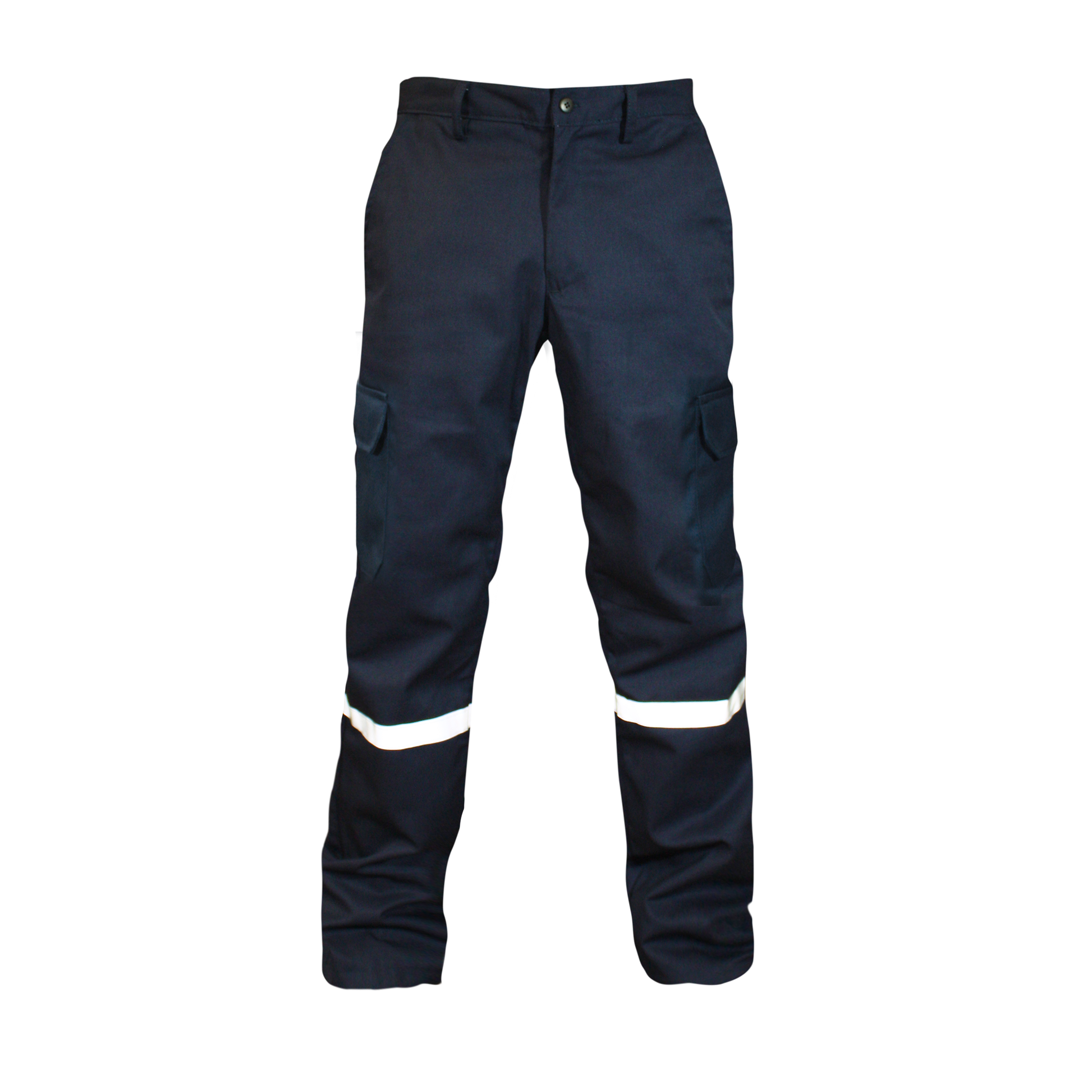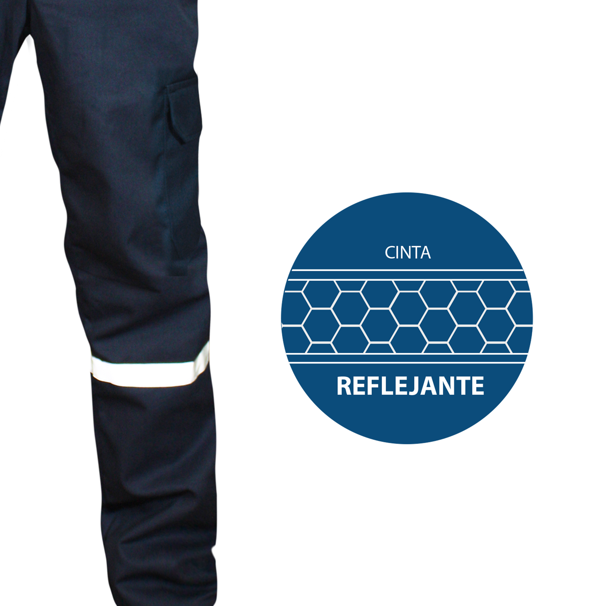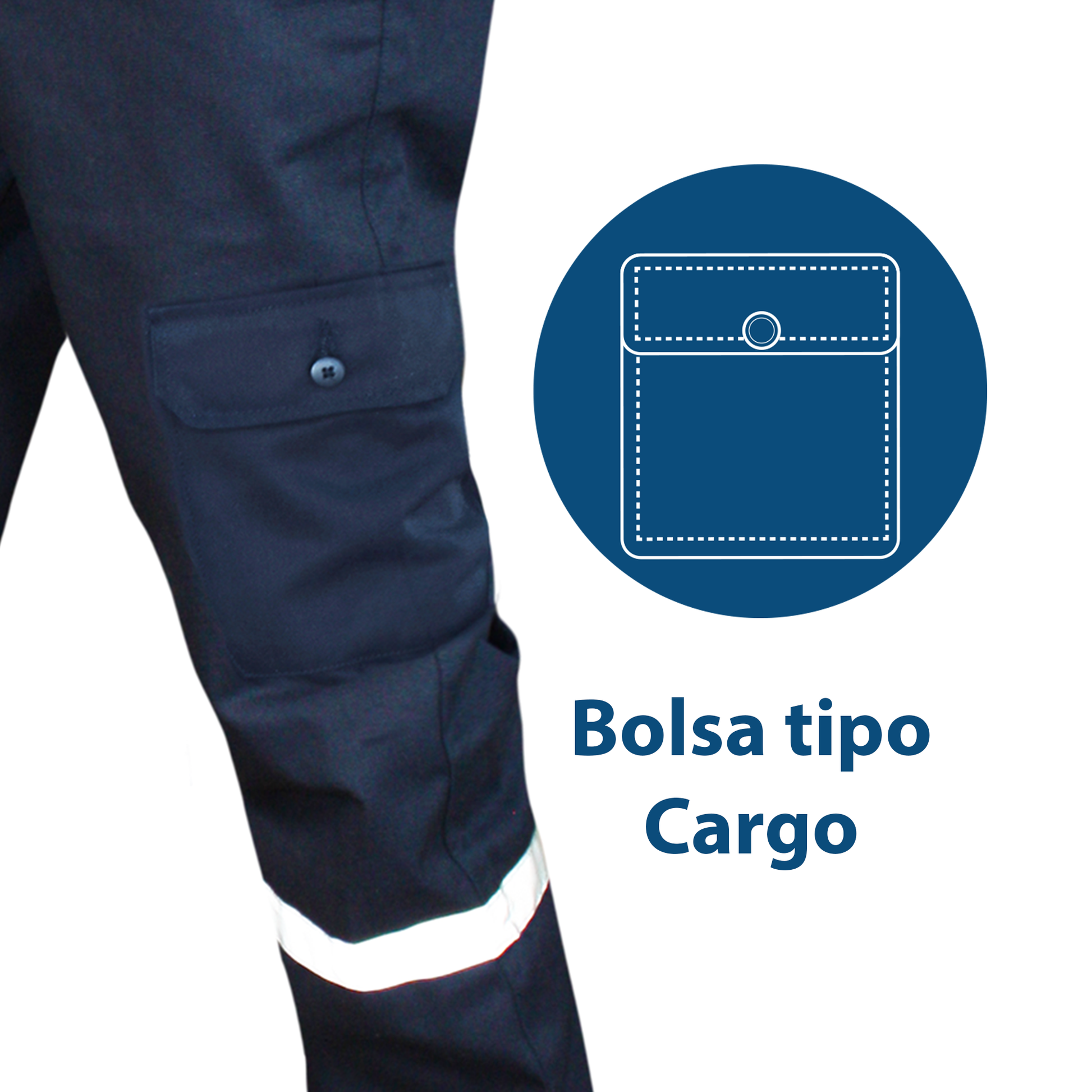 Características: Pantalón industrial tipo cargo, corte recto con o sin pinzas. 4 Bolsas, 2 traseras de vivo, 2 bolsas delanteras en diagonal de fácil acceso. 2 bolsas cargo en piernas. Confeccionado con pretina de 5 trabas adicionada con fusionador QST y trabillas con Q-Loop M, botón y cierre plástico de alta resistencia antiestático. Costuras reforzadas en entrepierna, costados y pretina. Remalles interiores en prenda con costuras reforzadas 5 hilos. Cinta reflejante de una pulgada de ancho color plata.