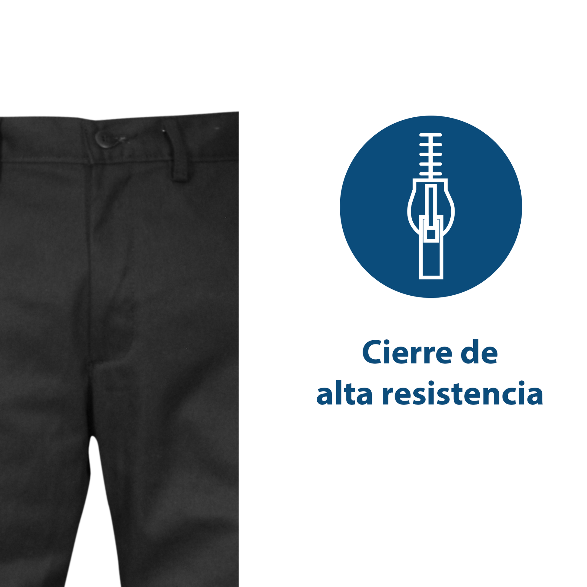 Pantalón corte recto con 2 bolsas traseras de un vivo, 2 delanteras en diagonal, cierre plástico antiestático. Manta o pocketing interior en bolsas delanteras. 5 trabillas amplias en pretina. Bastilla en bajos