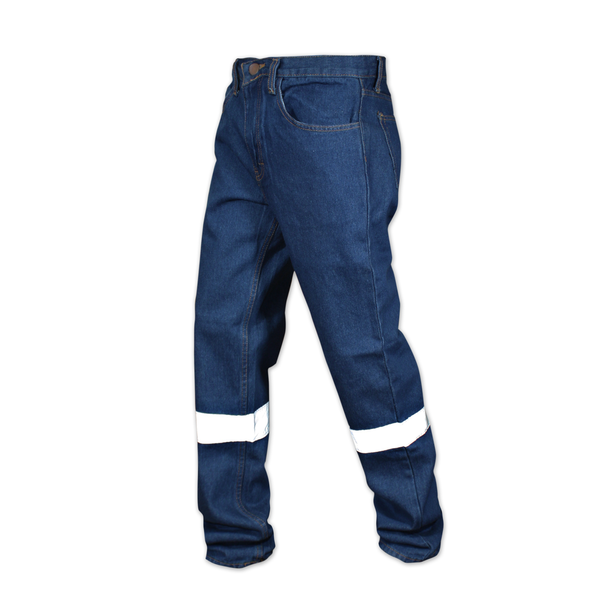 Pantalón tipo vaquero silueta caballero 5 bolsas, cierre metálico. Manta o pocketing interior en bolsas delanteras. 5 trabillas amplias en pretina. Bastilla en bajos. Cinta reflejante 2” en piernas debajo de las rodillas. Costuras reforzadas en pretina, costados y entrepierna que brindan resistencia y durabilidad en toda la prenda.