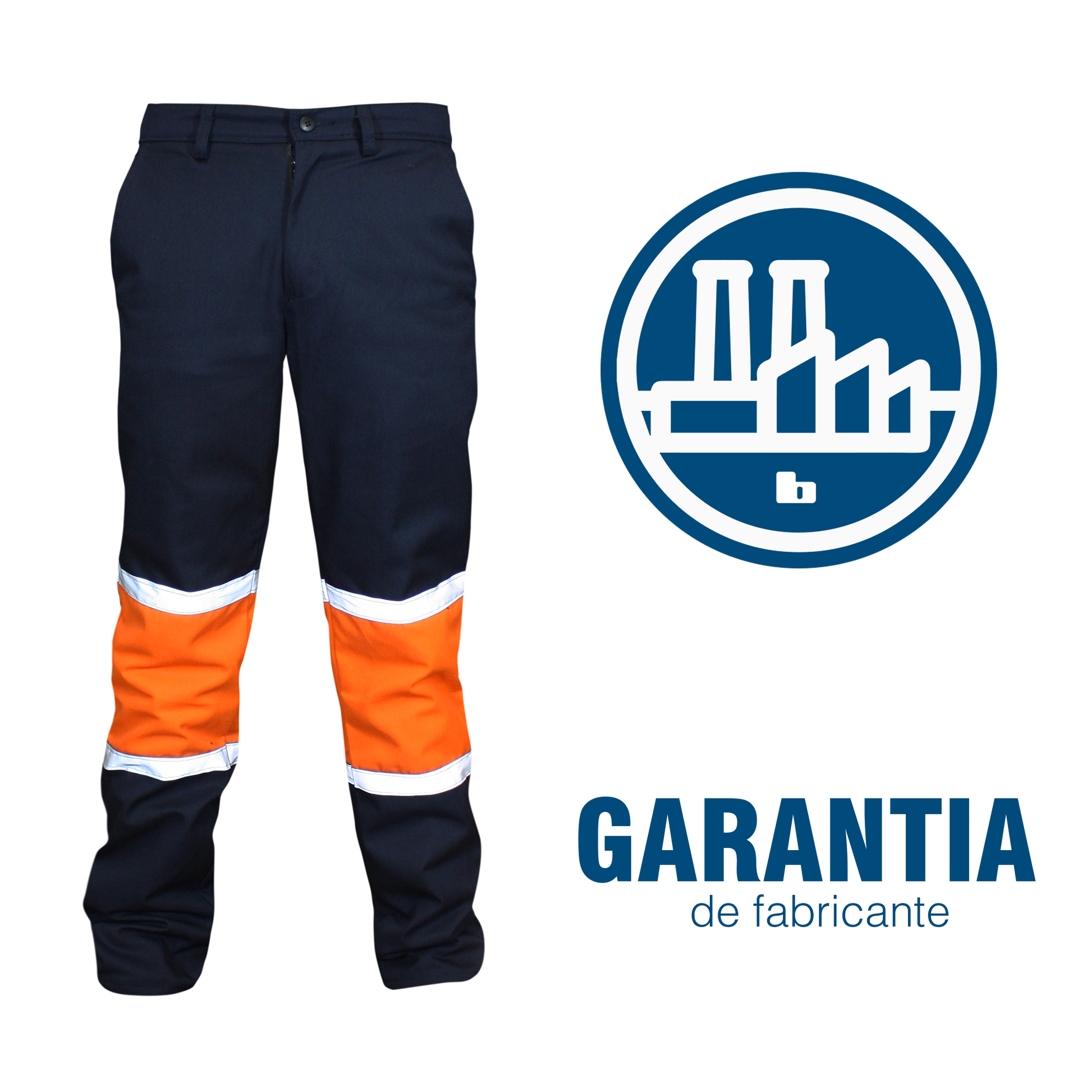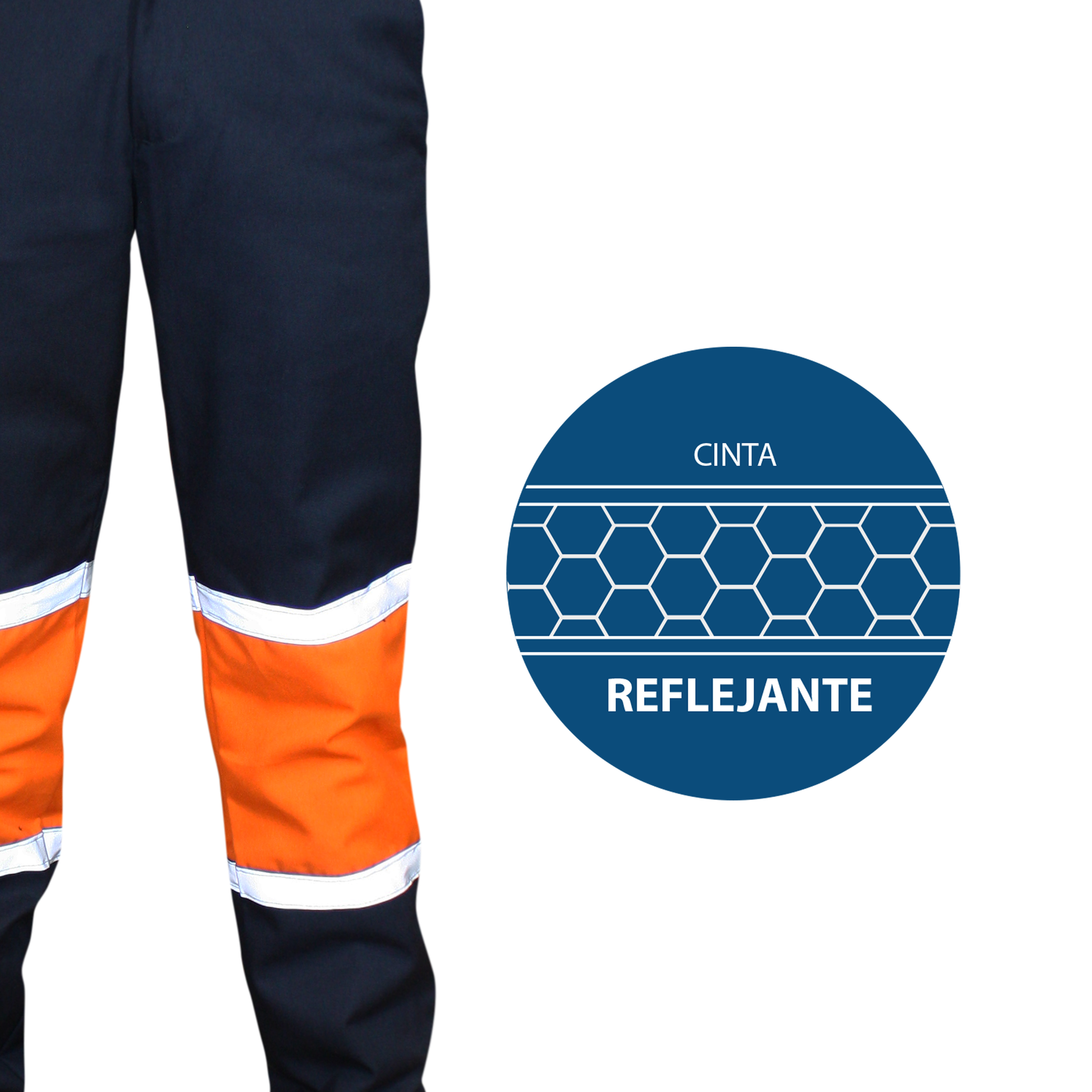 Para mayor visibilidad, cuenta con doble cinta reflectante 3M de 2” color gris plata y vivos en gabardina NARANJA de alta visibilidad (A.V.) en piernas.