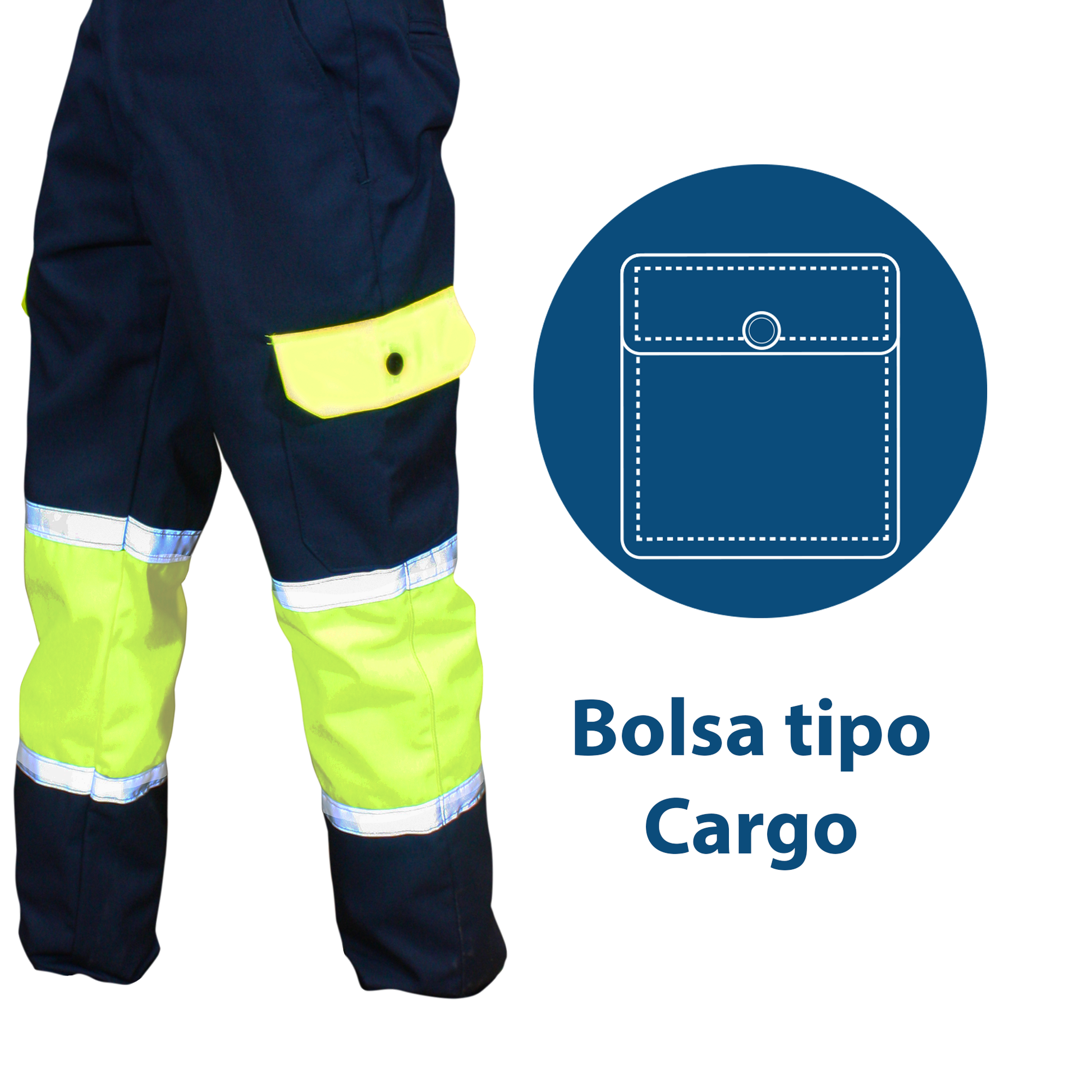 Diseñado para combinar funcionalidad y seguridad. Cuenta con dos bolsas traseras, dos delanteras en diagonal y dos laterales tipo cargo con cartera, cierre de plástico antiestático.