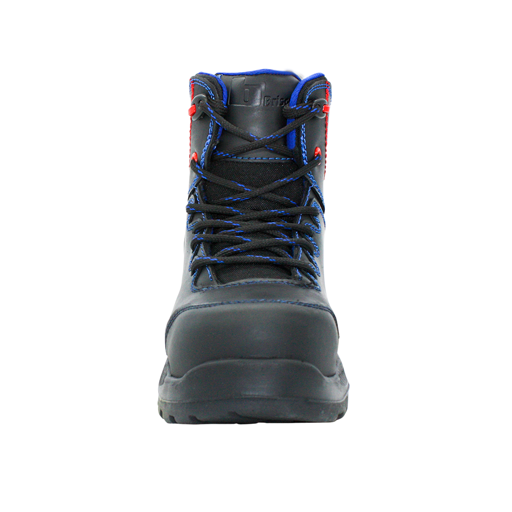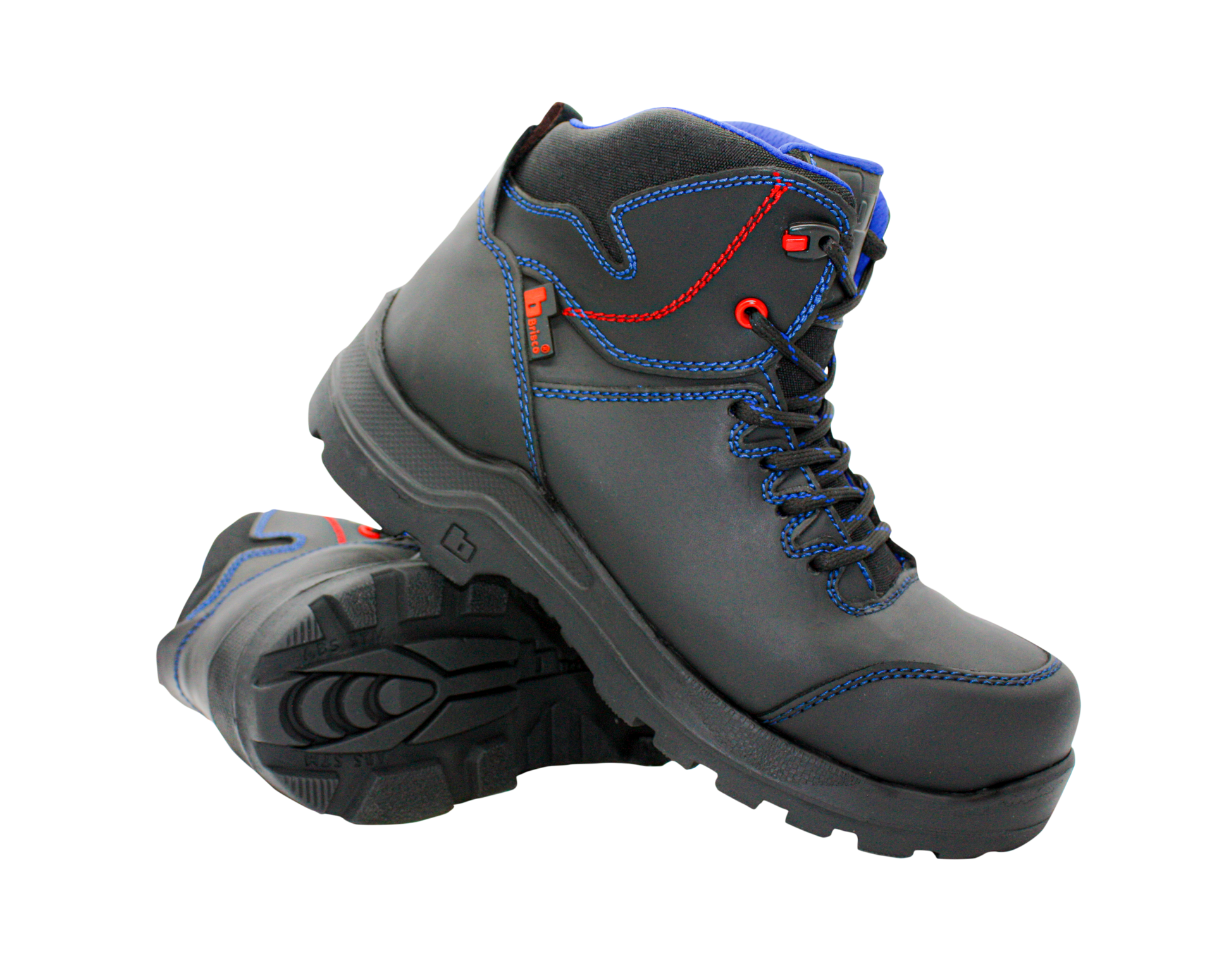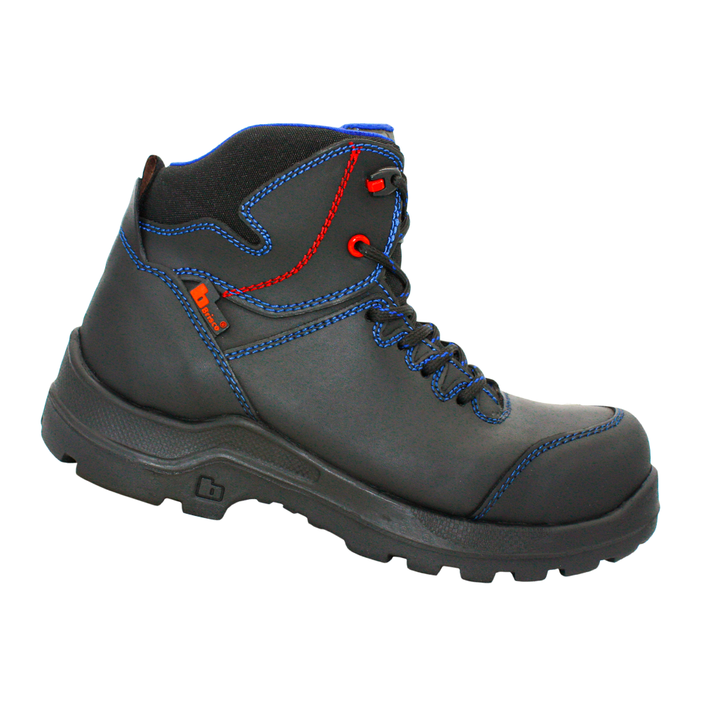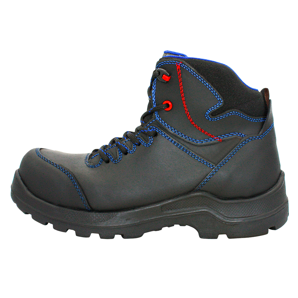 Calzado ergonómico dieléctrico tipo borceguí, color negro con vivos azules y rojos, cuenta con doble protección en la puntera.