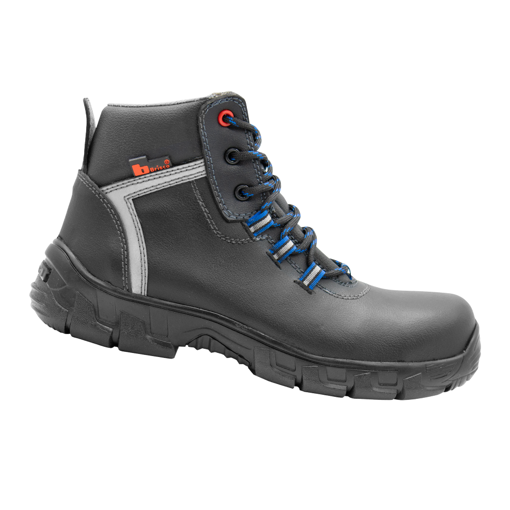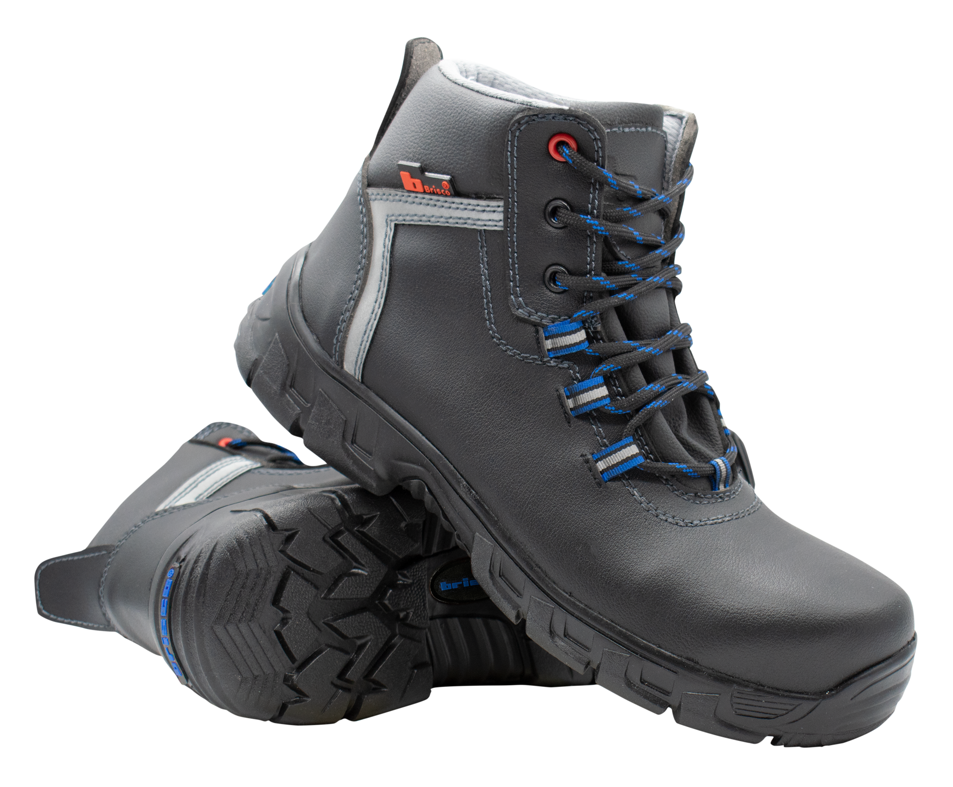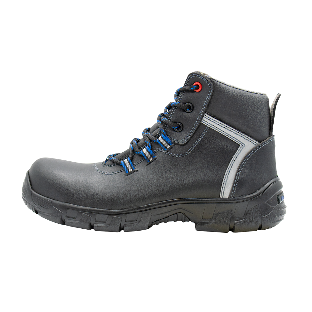 Calzado ergonómico dieléctrico tipo borceguí, color negro con vivos en azul y gris, cuenta con protección en la puntera.