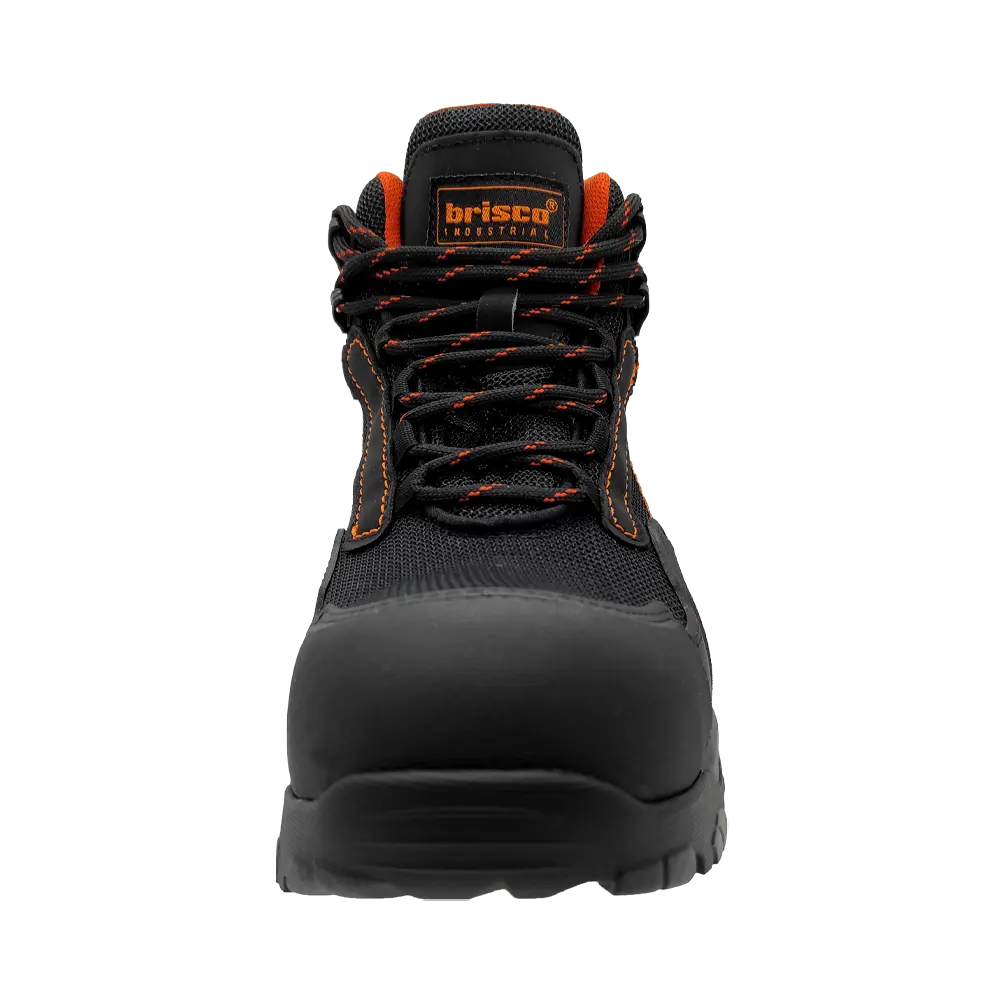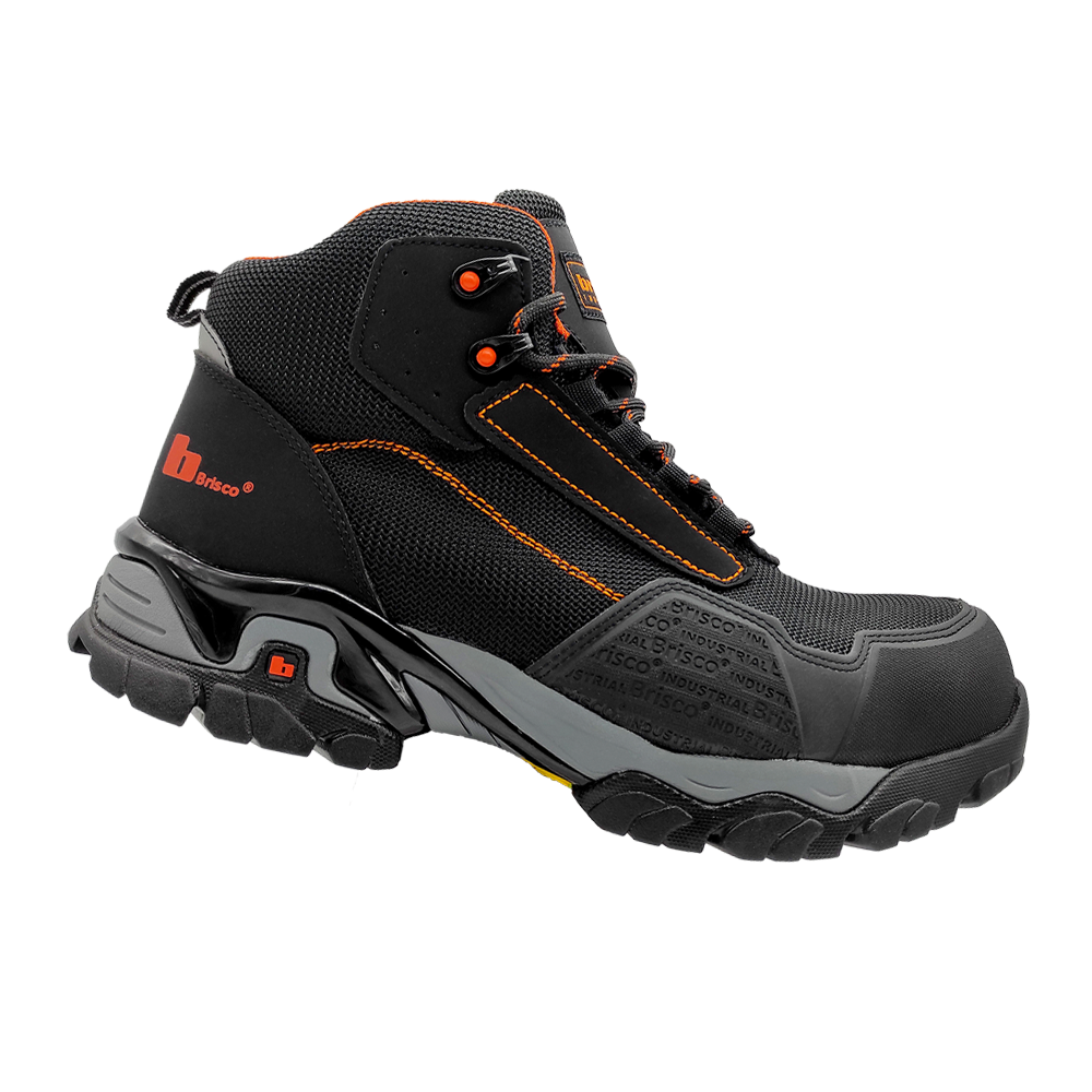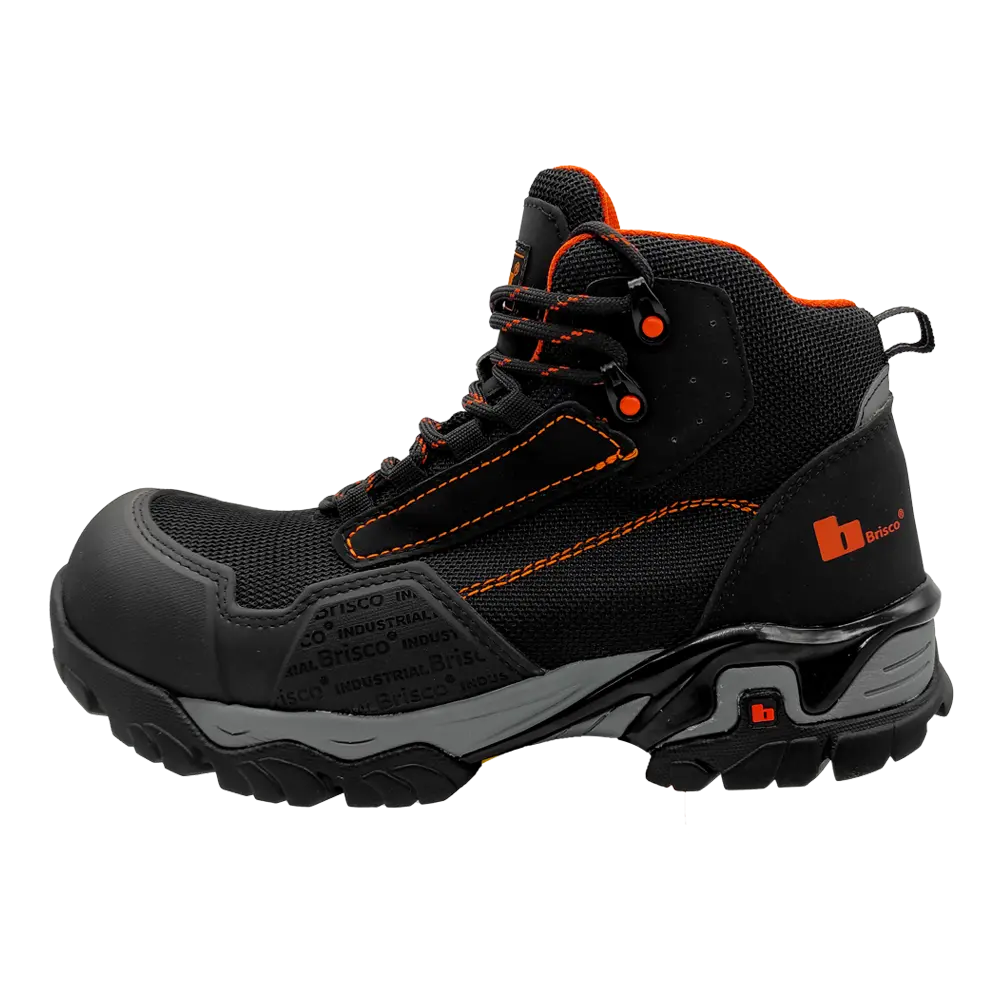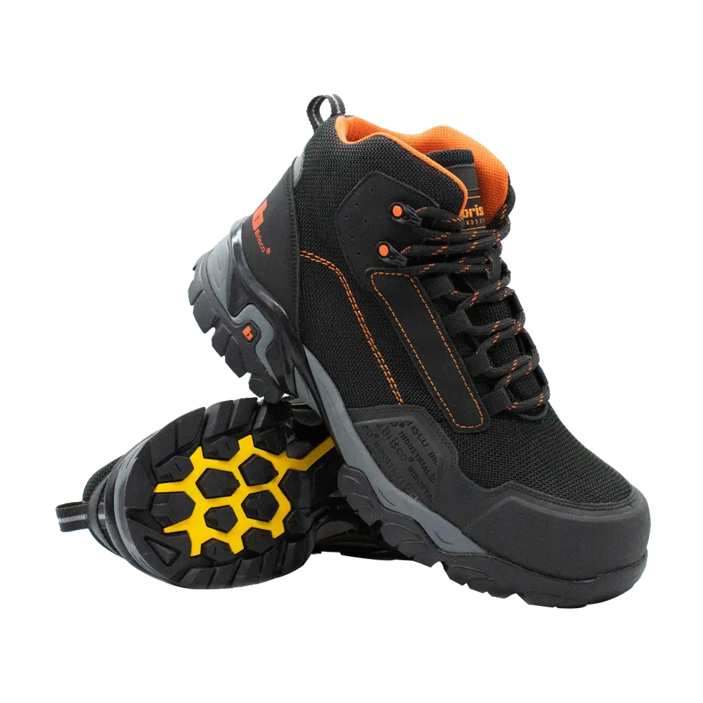 Calzado ergonómico dieléctrico tipo borcegui, antiderrapante, color negro con vivos en naranja, cuenta con doble protección en la puntera (resistente a abrasión).