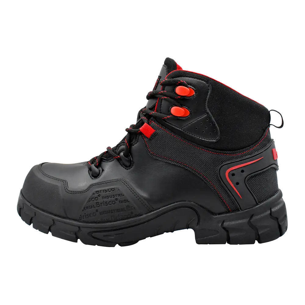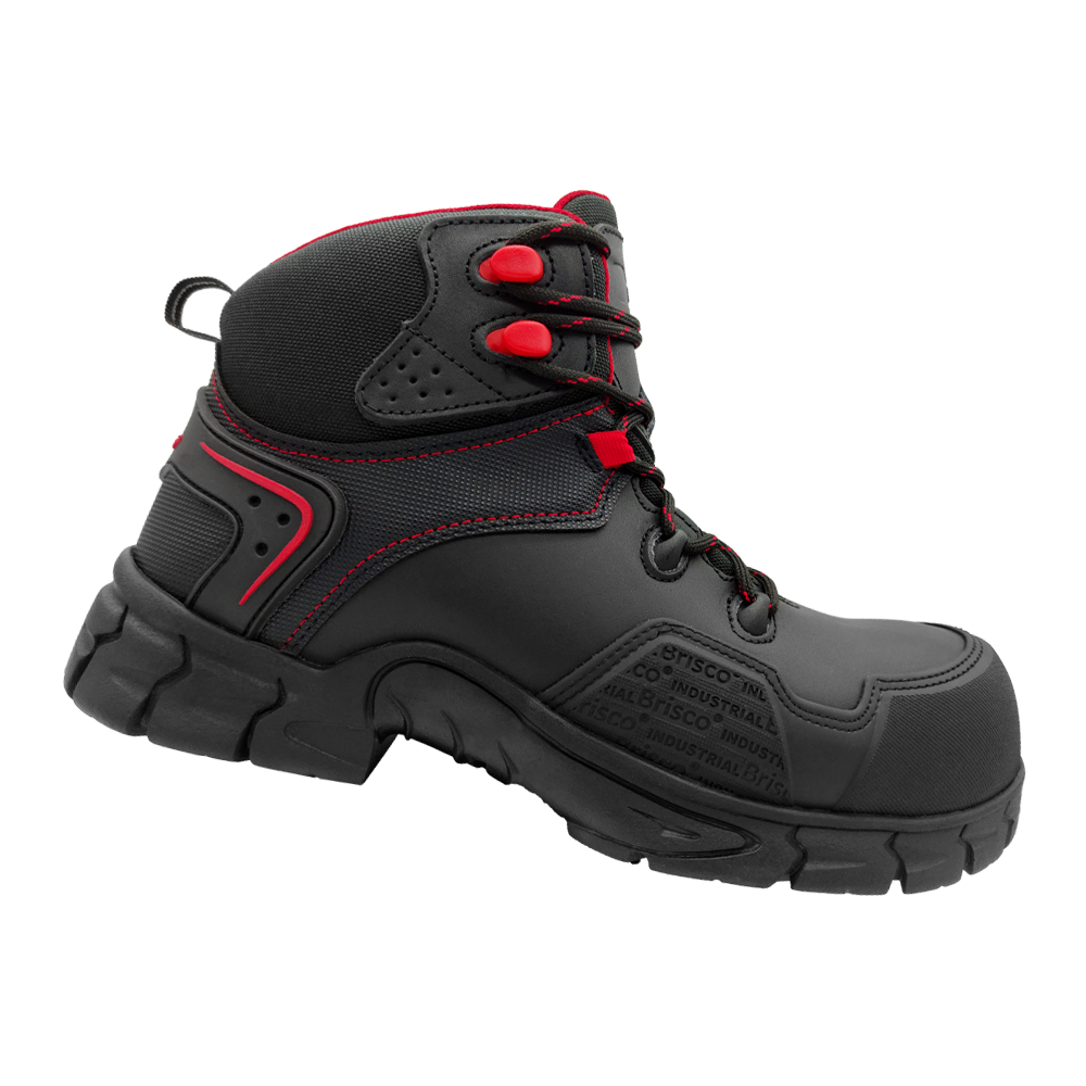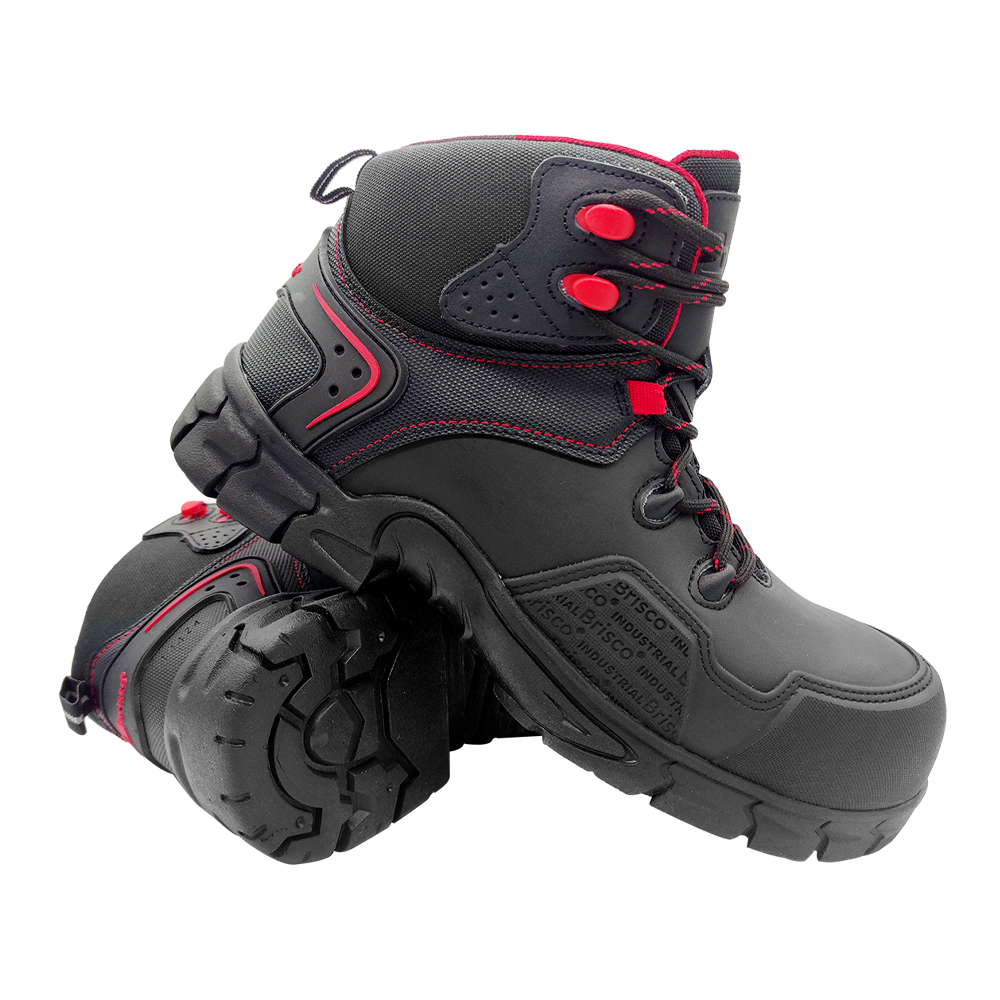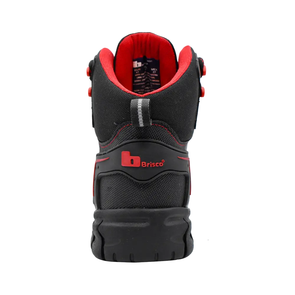 Calzado ergonómico, dieléctrico tipo borceguí, color negro con vivos en color rojo, cuenta con doble protección en la puntera (resistente a abrasión).